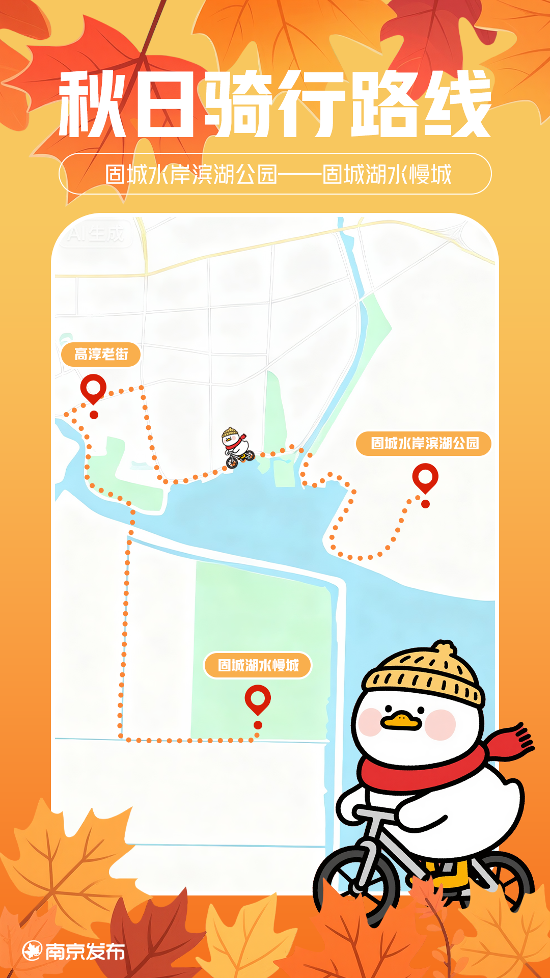 路线特点:以高淳老街为起终点,串联了最具代表性的水乡景观,可随时停下来品尝美食、参观景点。固城湖大桥是全程唯一的小“挑战”,桥面略有缓坡,但对新手毫无压力。非常适合家庭骑行、初学者适应和游客快速领略高淳水乡魅力。