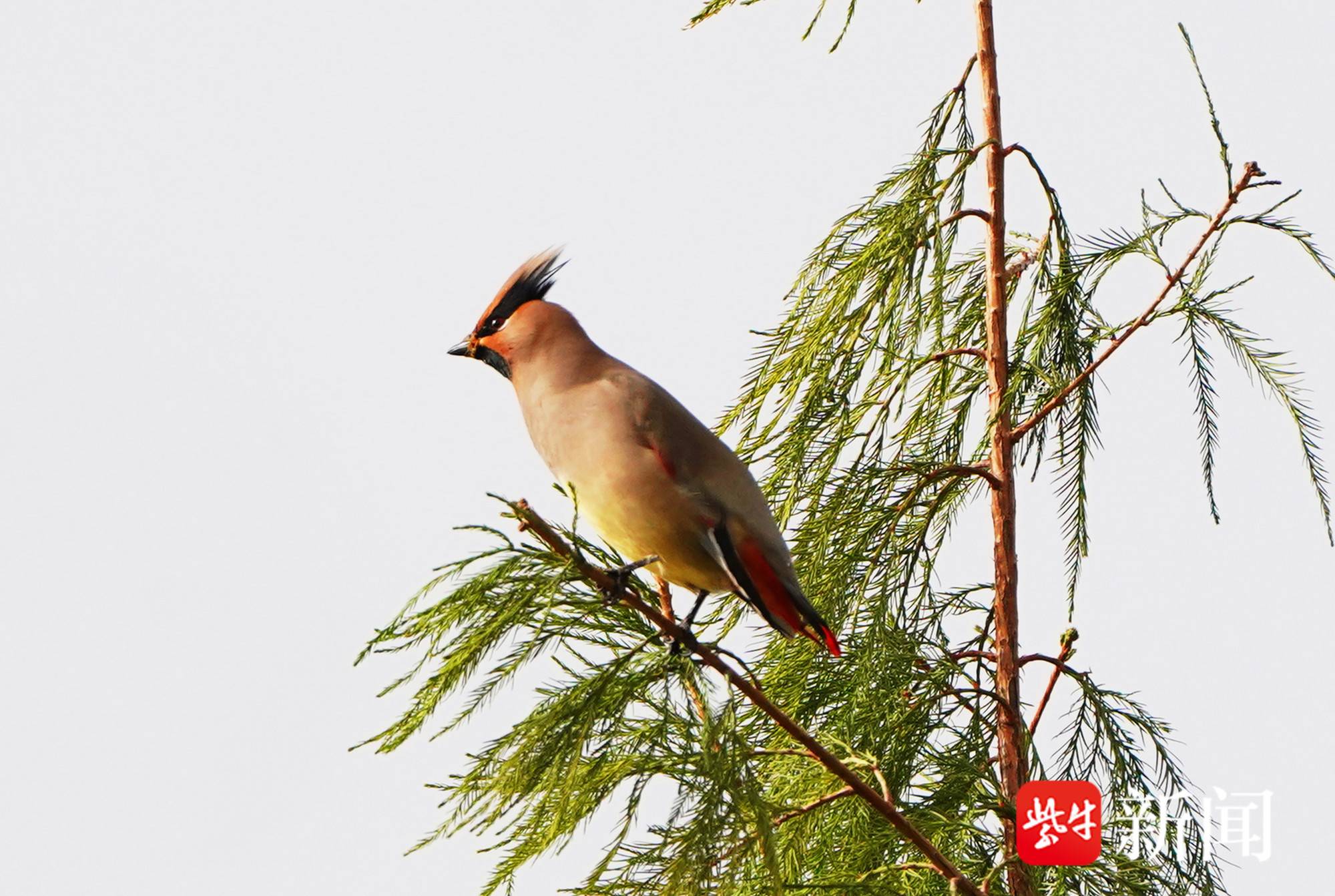 “飞来情侣园的太平鸟,数量多达上百只,比起以往要多得多,实属罕见。”一位爱鸟市民朱先生称,这也是他第一次见到这么多的太平鸟。“头部顶着一撮簇状橘红羽冠,眼部周围及下颌像画了黑色眼影,翅膀和尾部还夹杂红黄黑多种颜色。”他说,这种太平鸟的个头跟麻雀鸟大小一样,身体圆圆滚滚,像个彩色毛球一样,惹人喜爱。