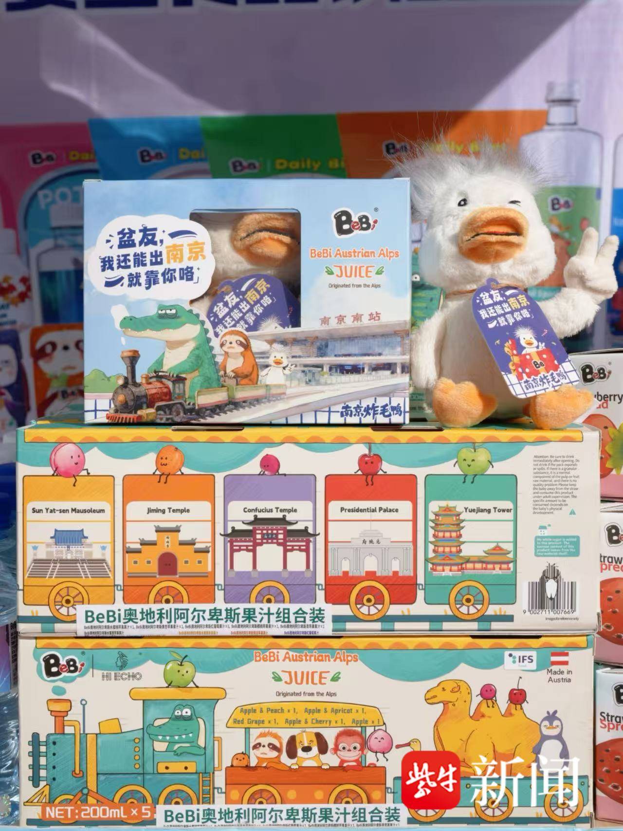 本届入选的伴手礼最鲜明的特征是“文化”与“创意”的深度融合。它们不再仅仅是商品,更是南京城市文化的叙事者。现场,一款由南京本土品牌BeBi精心打造的奥地利进口果汁,成功入选南京市特色伴手礼名录。这款果汁最引人注目的,莫过于其巧妙融入南京地方特色的设计语言。礼盒包装上有中山陵、鸡鸣寺、夫子庙、总统府、阅江楼这五座南京文化地标的插画,既保留了深厚的文化底蕴,又符合当代年轻人的审美趣味。