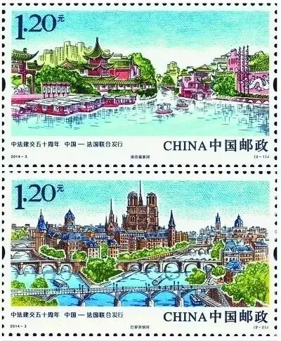 ○2014年,为庆祝中法建交50周年,中法联合发行了两枚纪念邮票,画面分别是南京的秦淮河和巴黎的塞纳河。
