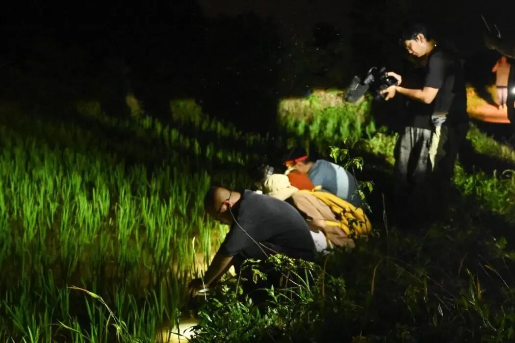红山森林动物园野生动物救助中心工作人员夜探“归来兮”,调查生态农田生物多样性情况,记录蛙分布种类,为无斑雨蛙放归选择适宜生境。