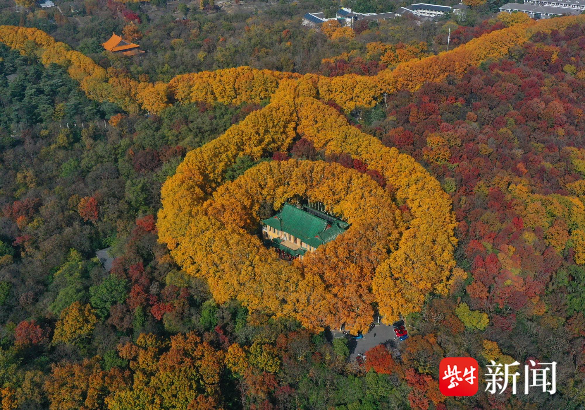 从空中俯瞰,中山陵外的陵园路被沿路的黄色梧桐树叶勾勒,宛如一条“项链”;小红山上的环山路,则犹如项链上的吊坠;美龄宫的主体建筑,便成为镶嵌在吊坠上一颗璀璨的绿宝石——一条巨大的金黄色项链,由自然界的造物构成,仿佛由大自然调配而成,令人惊叹。