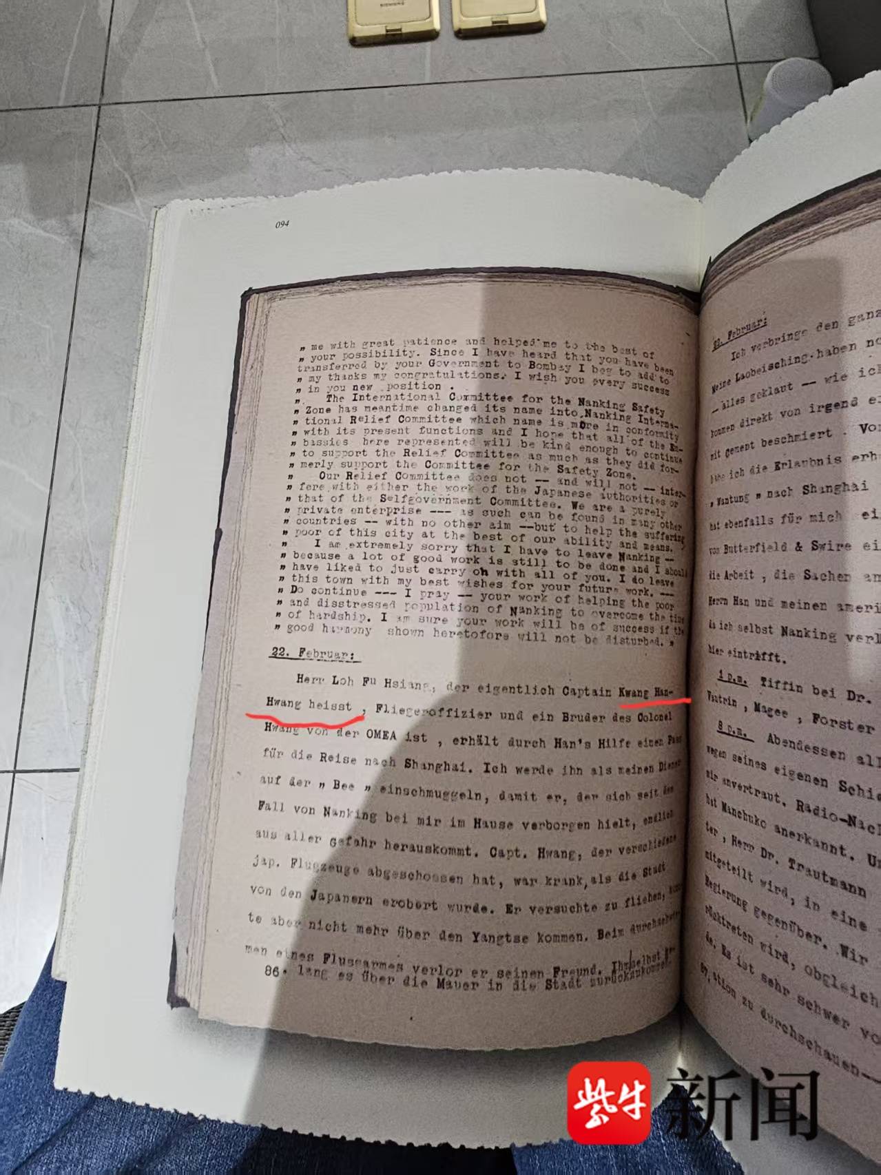《拉贝日记》原文中,这位中国飞行员的名字为“Kwang Han-Hang”