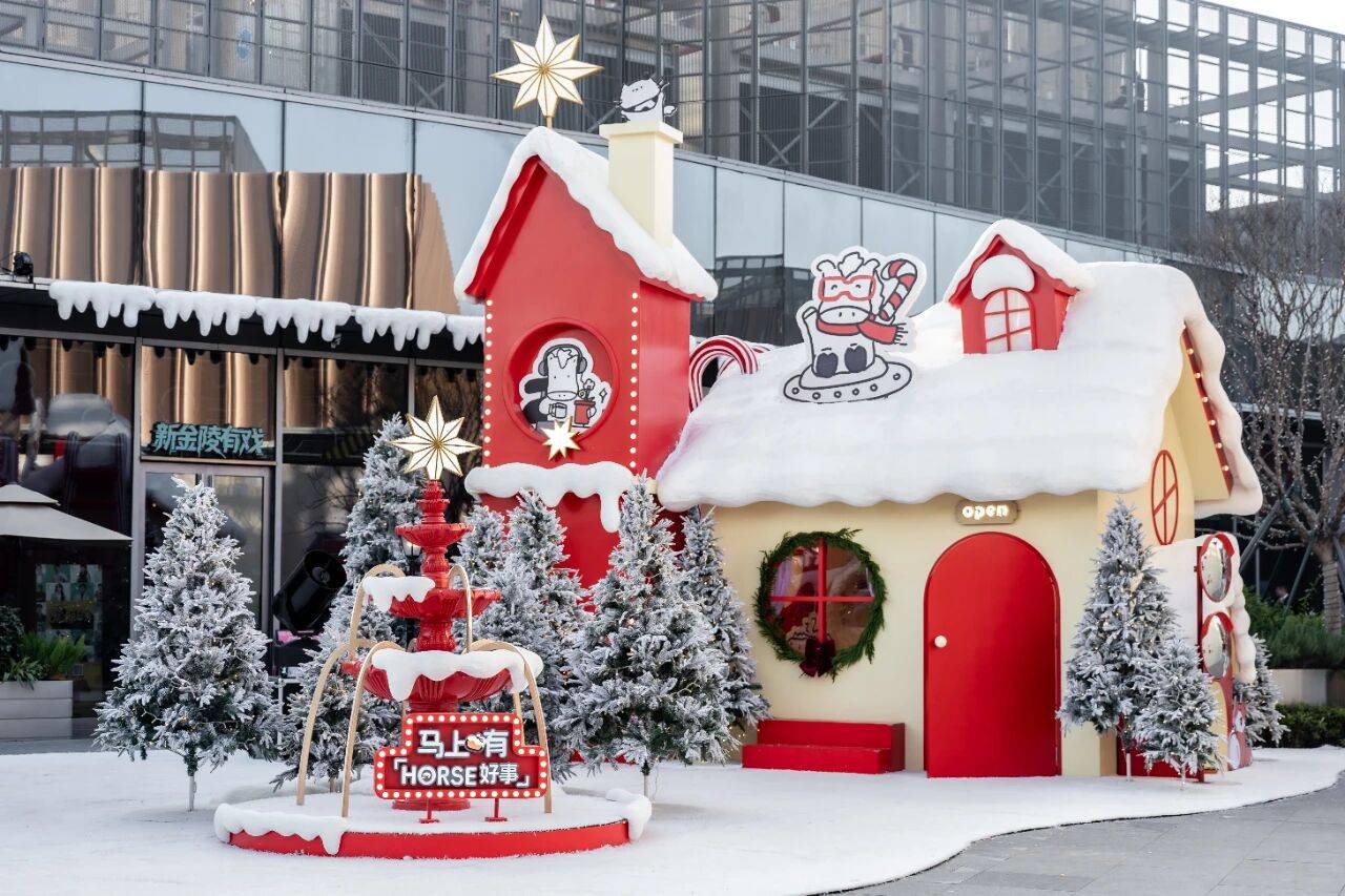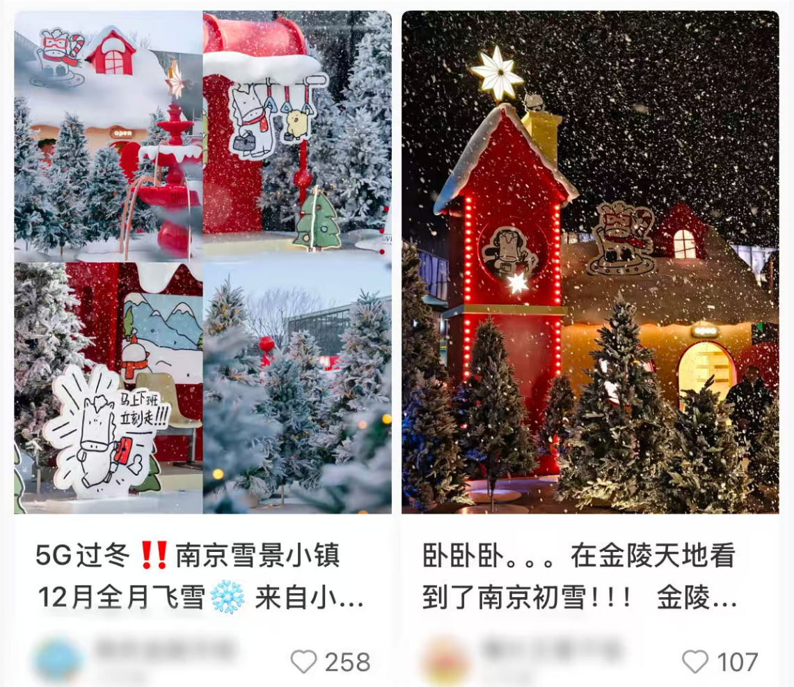 金陵“下雪”啦!近日,南京建邺区出现了“雪景打卡点”。在小红书等社交媒体上,网友们纷纷晒出了在金陵天地L6的屋顶公园拍出的浪漫“雪景照”。12月4日,记者探访现场,眼前已经改造成沉浸式童话雪景小镇。柔软的白色毛绒地毯模拟雪地,红色童话小屋前装点着一棵棵雪松,旁边还摆放着道具雨伞,为拍照的市民添了几分场景感,营造出温暖的冬日氛围。