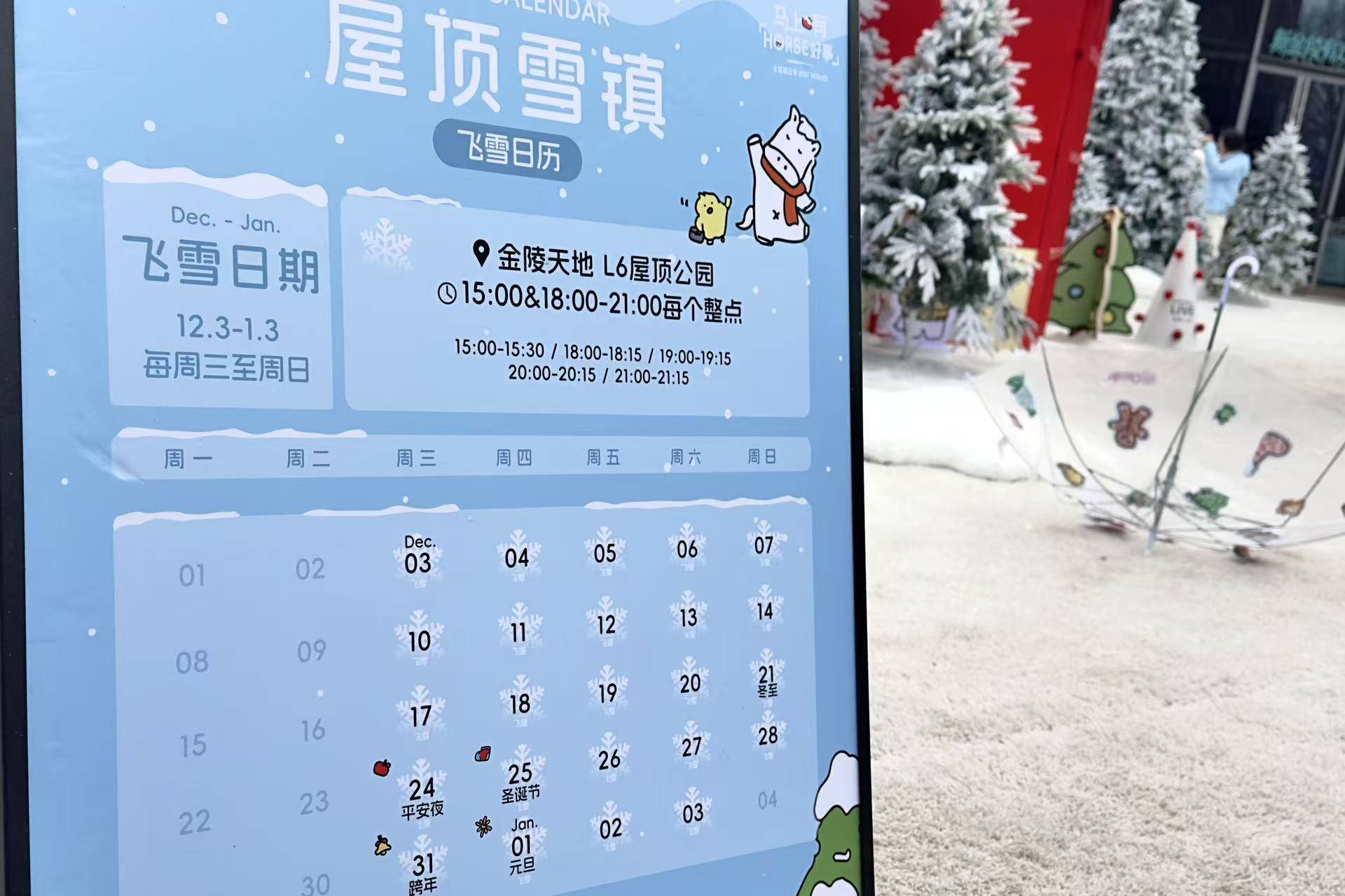 据悉,2025年12月3日至2026年1月3日,每逢周三到周日,这里将限时“飞雪”。市民可漫步在星光灯下,看雪花轻轻覆盖街景,还能在1000m²四个不同的雪境点位打卡留念——在屋顶雪镇,漫步星光灯下,俯瞰被雪花覆盖的街景;在1号门前,观赏动态雪景风光,开启你的雪镇旅程;在曼哈顿雪林,建筑披上雪绒外衣更显冬日静谧;在城市客厅“巨型雪松”,超大圣诞树雪贴映照成为城市冬日最浪漫的画框。