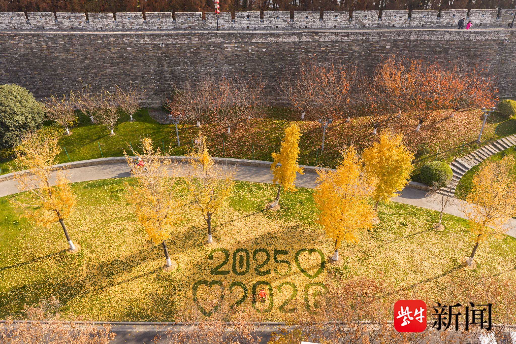 南京城墙下的银杏叶被拼成“2025爱2026” 成网红景点引市民游客排队打卡