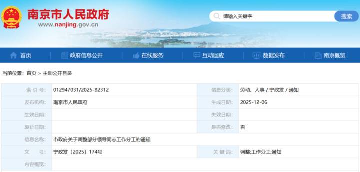 南京市人民政府关于调整部分领导同志工作分工的通知