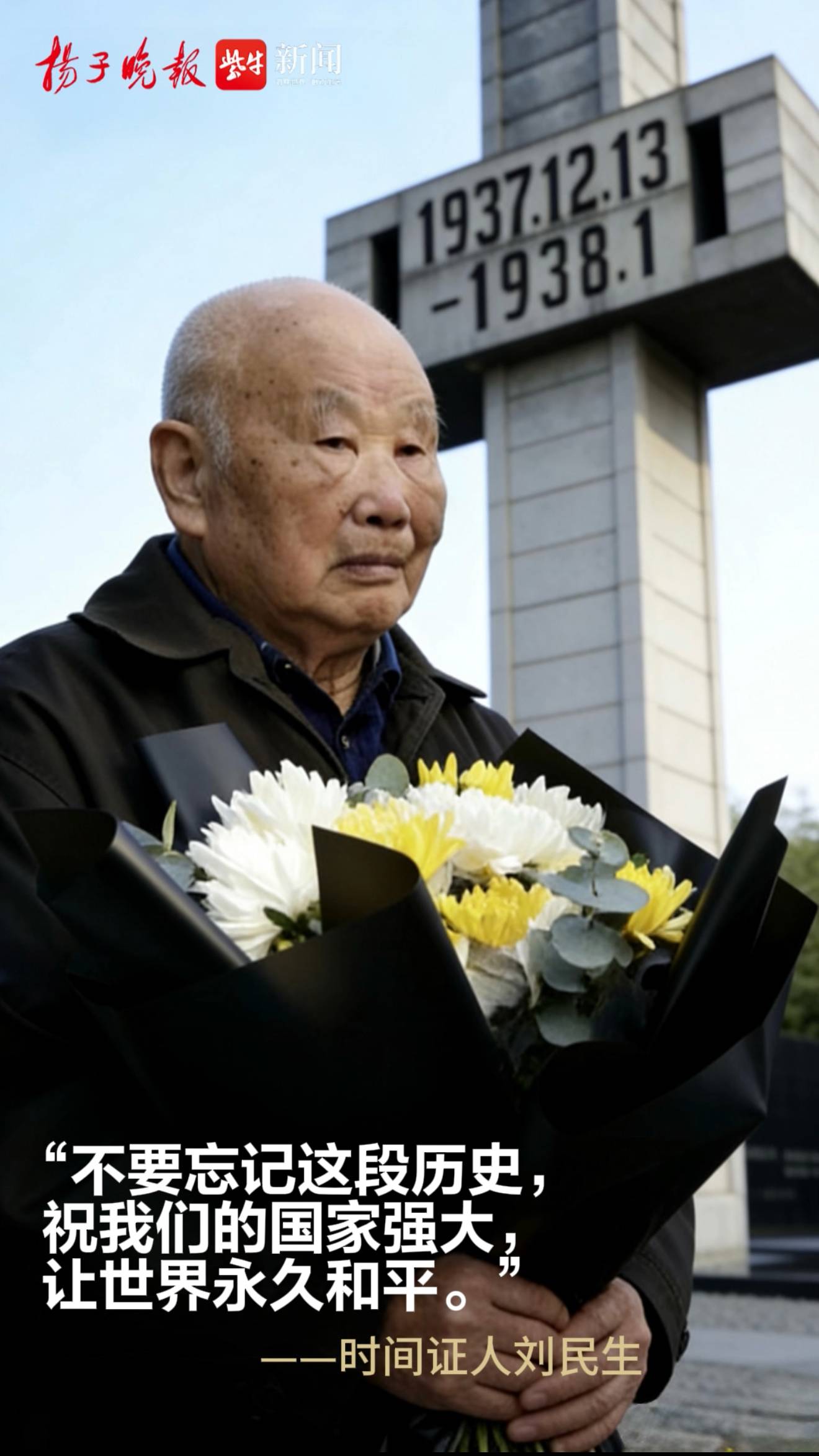 现年91岁的南京大屠杀幸存者刘民生在南京大屠杀期间,是一个年仅3岁的孩童,和全家逃进金陵女子文理学院难民收容所避难,父亲被抓走再也没有回来,他的腿上被日本兵刺了一刀,至今右腿还留有伤疤,刘民生说:“我们今天呢,希望他们可以通过我们的回忆,亲身经历,让他们知道这段历史,不要忘记这段历史。祝我们的这个国家强大啊,让世界永久和平。”
