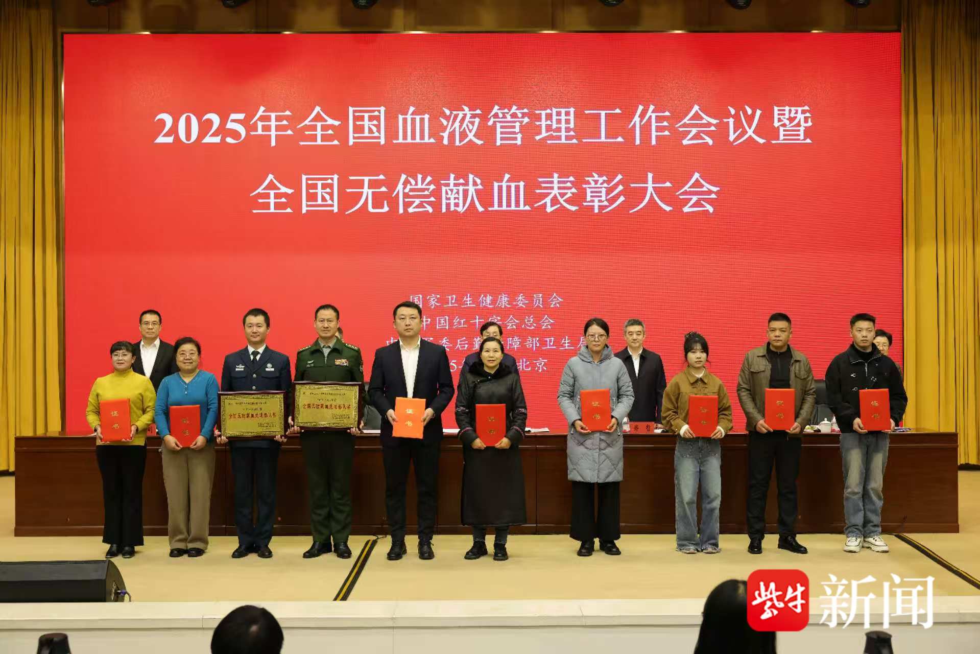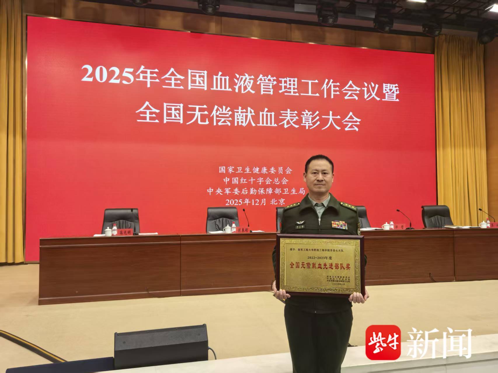 扬子晚报网12月11日讯(通讯员 吴广辉 高昂 王敏 记者 闫春旭)12月11日,在北京举行的2025年全国血液管理工作会议暨全国无偿献血表彰大会上,陆军工程大学野战工程学院某学员大队,获得由国家卫生健康委员会、中国红十字会总会和中央军委后勤保障部卫生局联合颁发的2021-2023年全国无偿献血先进部队奖,该大队领导代表全军获奖单位和个人上台领奖并发言。