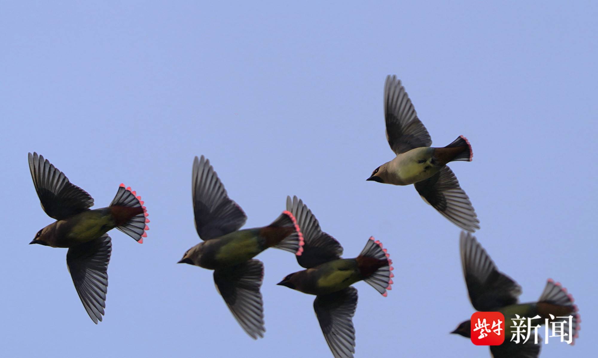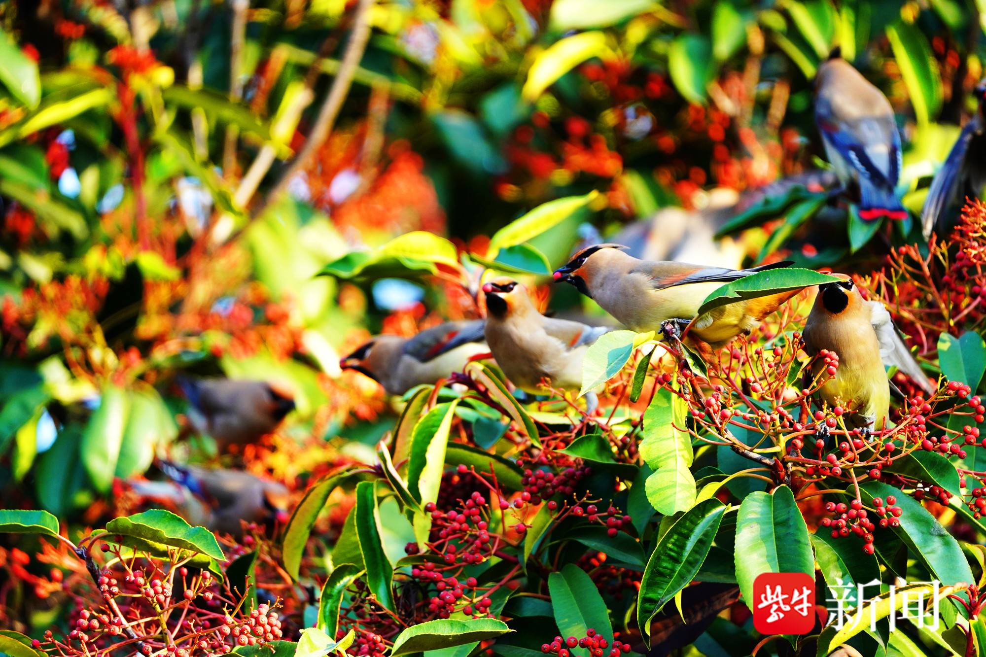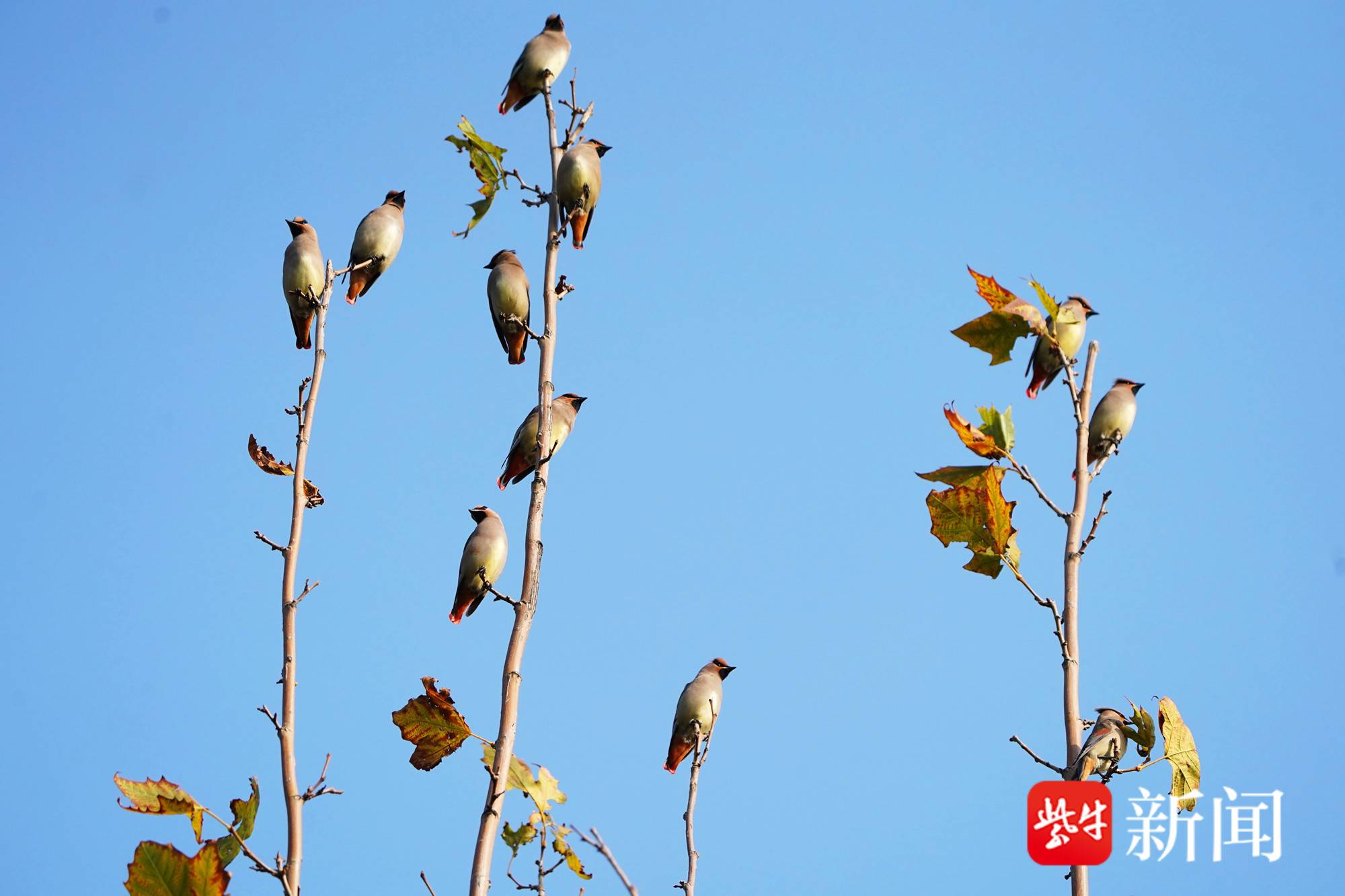 扬子晚报网12月11日讯(通讯员 武家敏 记者 梅建明)眼下,冬日的南京,天气温暖如春,而南京玄武湖畔,一群群头戴银灰色发冠、身着彩色外套的太平鸟如期而至,啸聚枝头,热闹非凡。