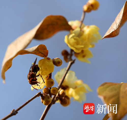 扬子晚报网12月16日讯(通讯员 徐福庚 记者 闫春旭)南京明孝陵的蜡梅绽放,与蓝天白云相映,构成一幅优美的冬日画卷。一只大黄蜂凑热闹,为整个画面增添了不少生机和趣味,仿佛能感受到它忙碌采蜜的喜悦。