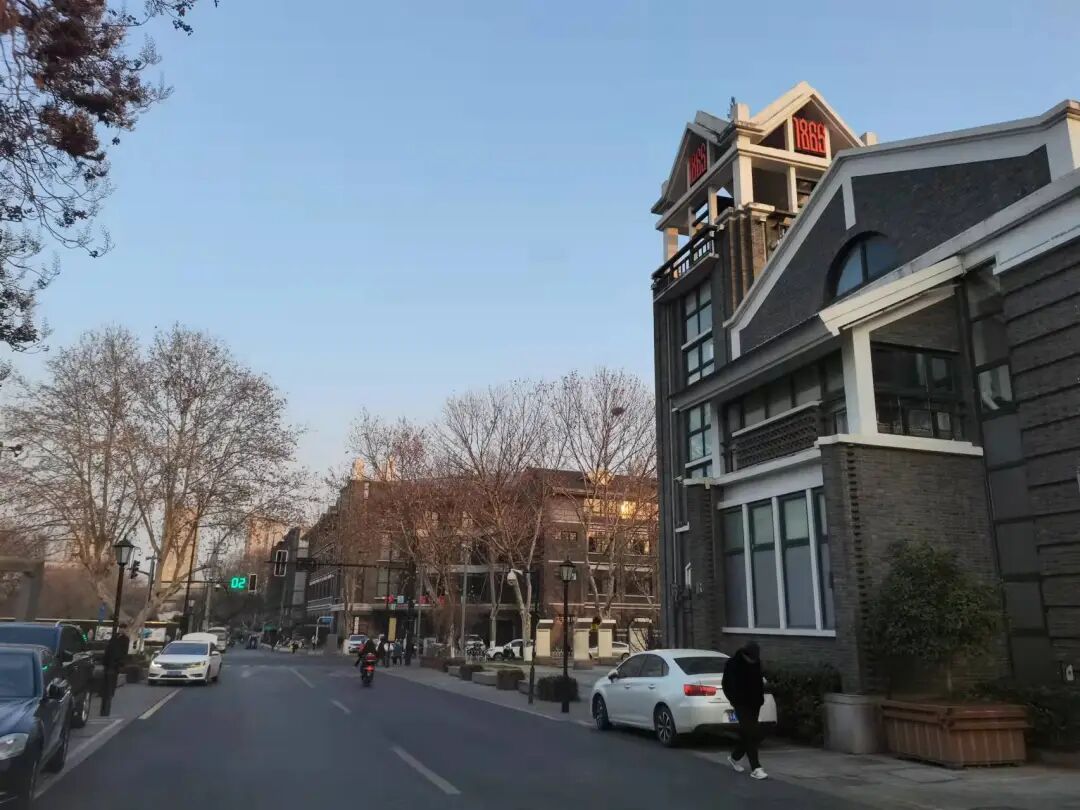 沿途走过,还可以看到许多店铺:德云饭庄、荣园新海派餐厅、漫心酒店……而这其中有两间店非常惹眼。一家是在巷角转弯处的“漫好阁”,整面墙的玻璃映照着没入城墙的夕阳。另一家则是有着红色绿色玻璃的“玫瑰里”,斑斓的色彩在安静灰色的小巷,让人眼前一亮。
