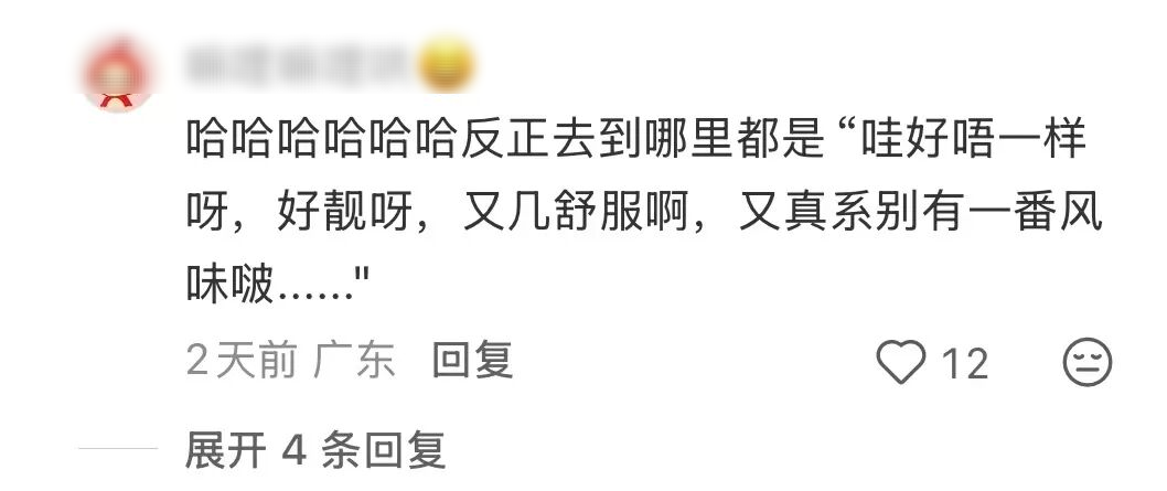 ○ 事实上,广东人的确是真正的松弛感群体,“大裤衩+人字拖”走天下,无论去哪都是“哇好唔一样呀,好靓呀,又几舒服啊,又真系别有一番风味啵……”