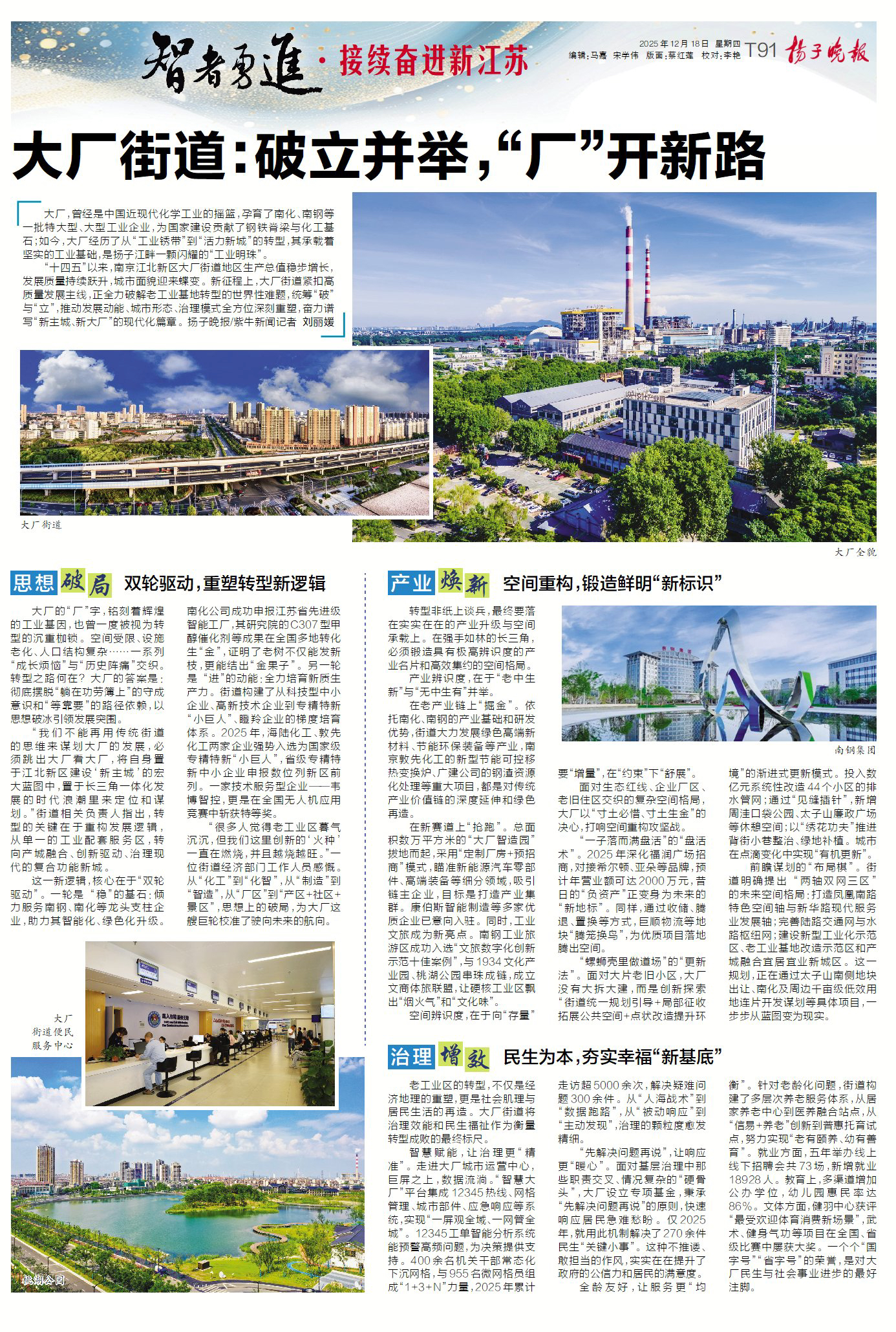 “十四五”以来,南京江北新区大厂街道地区生产总值稳步增长,发展质量持续跃升,城市面貌迎来蝶变。新征程上,大厂街道紧扣高质量发展主线,正全力破解老工业基地转型的世界性难题,统筹“破”与“立”,推动发展动能、城市形态、治理模式全方位深刻重塑,奋力谱写“新主城、新大厂”的现代化篇章。