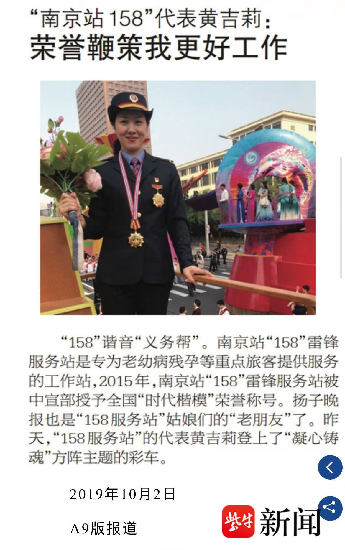 黄吉莉——2019年登上国庆70周年“凝心铸魂”彩车的客运员。本报记者与她独家连线时,她感慨:“和国家楷模同车,我深知荣誉更是责任。”