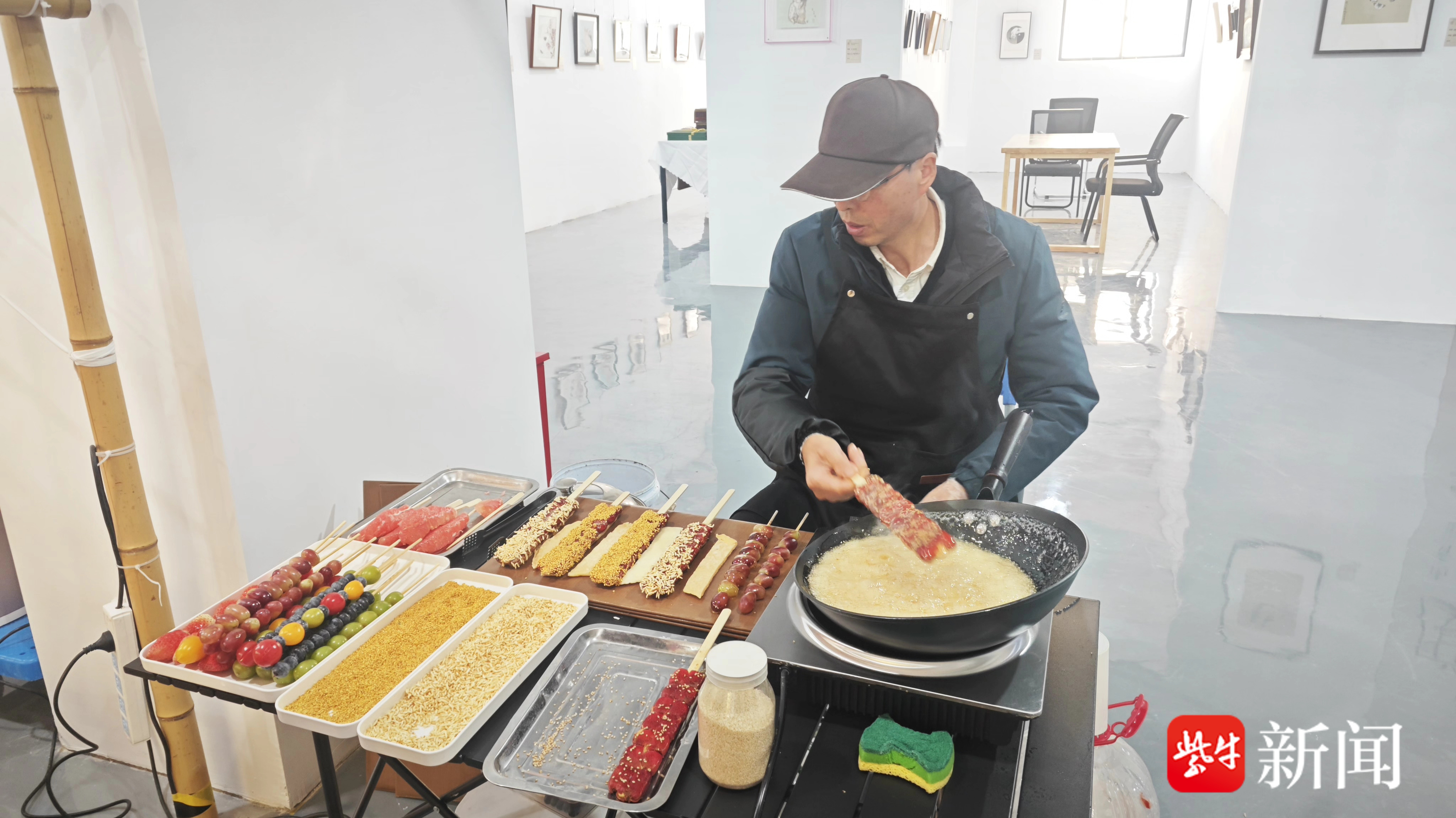 在这个充满艺术气息的市集空间里,记者一眼便被一个热闹的糖葫芦摊位吸引,摊位前整齐摆放着山楂、蓝莓、葡萄、草莓等多种口味的糖葫芦。糖浆在锅中咕嘟作响,飘散着诱人的甜香,摊主丁师傅正专注地熬制糖汁,制作今年备受欢迎的奶皮子糖葫芦。丁师傅笑言,自己做了十多年糖葫芦,这次特意来到玄武雅集,“这里环境清爽,秩序也好。”据他介绍,仅第一天摆摊,就卖出了三十多串奶皮子糖葫芦,今天又增加了很多备货,语气中透着对这场雅集人气与氛围的满意。