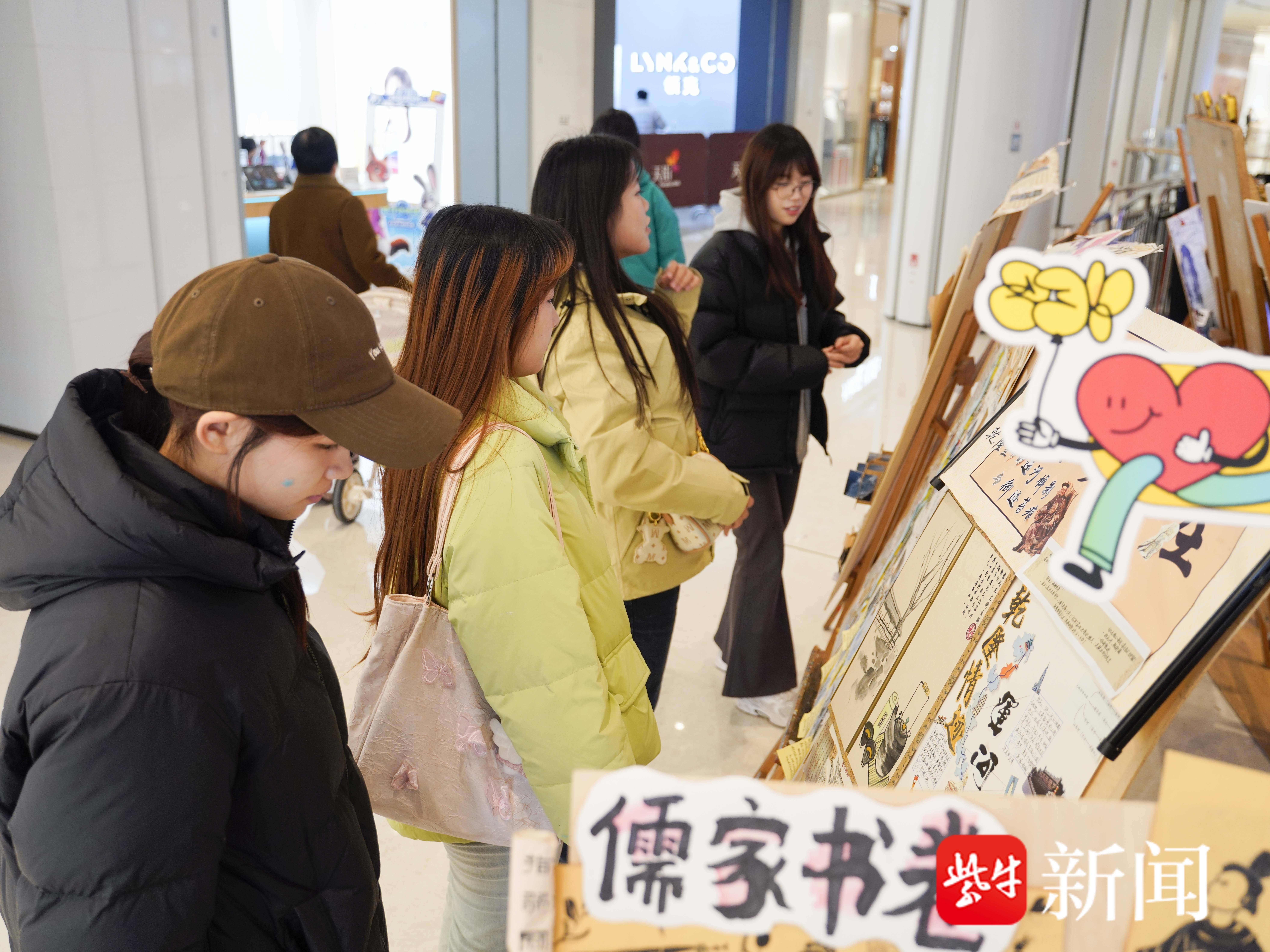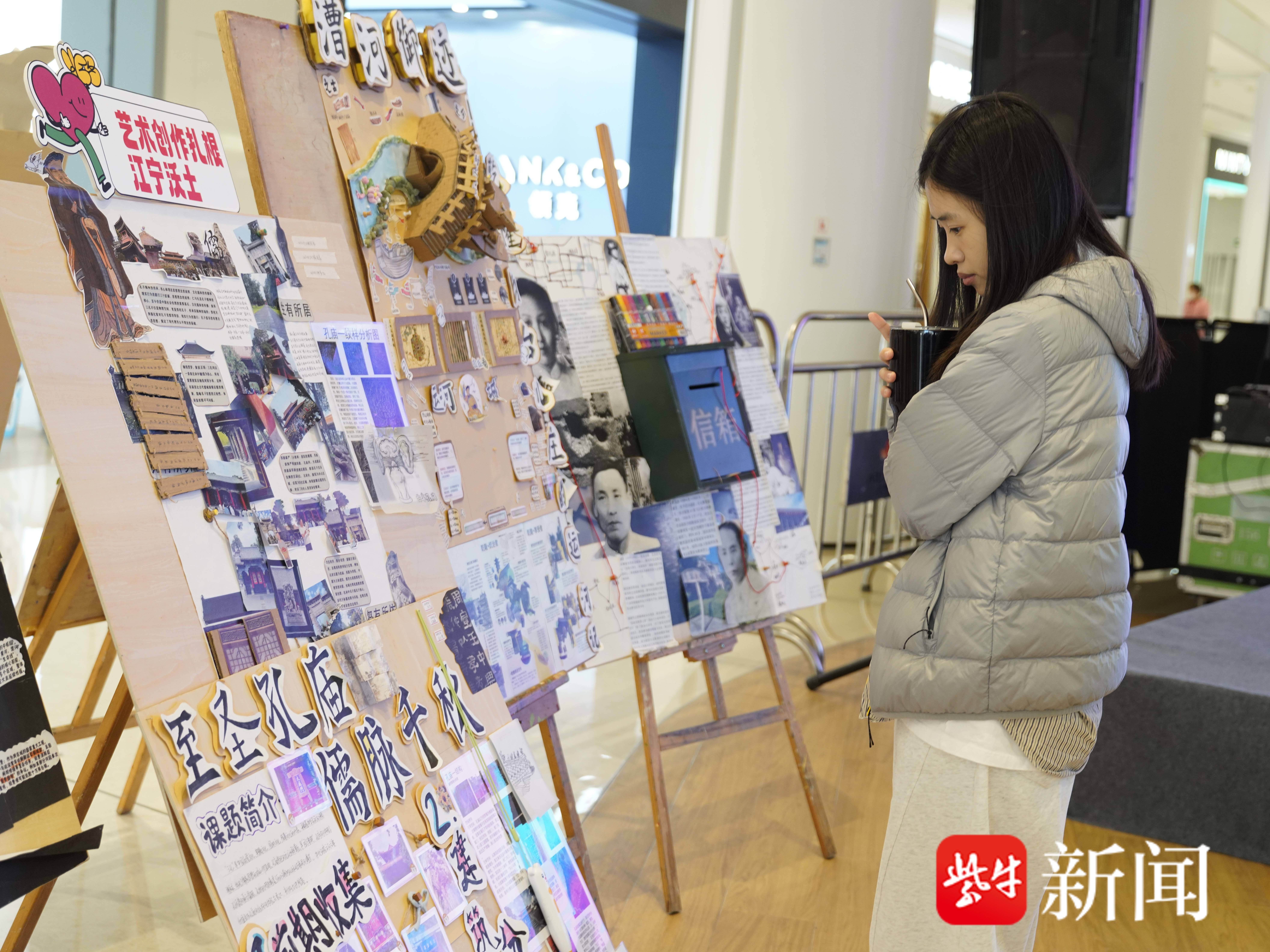 “公益展览”区围满了前来参观的市民。据了解,此次公益展览由崇华社工发起邀请,由南京航空航天大学金城学院艺术与传媒学院师生打造的“文化寻宝”艺术展顺利启幕。作为校社深度跨界联动的成果,该院师生深入江宁禄口街道禄乐家园、淳化街道等地挖掘本土文化,将徐州汉画像石纹样、曲阜儒家建筑秩序等文化元素,与江宁传统手工艺、邻里温情等在地资源相融合,创作出兼具专业质感与本土温度的艺术作品。