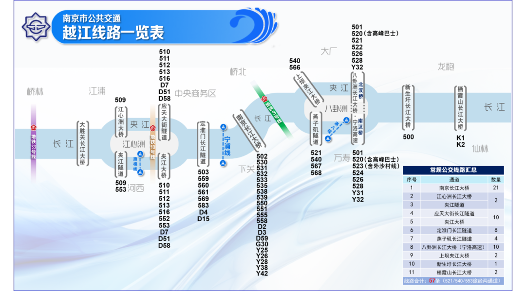 近年来,南京跨江公交体系持续完善。目前,全市已开通过江公交线路57条,线路全面覆盖南京长江大桥、栖霞山长江大桥、八卦洲长江大桥、江心洲长江大桥,以及燕子矶隧道、定淮门隧道、应天大街隧道等11个过江通道,形成了多点联通、覆盖广泛的跨江公交网络,全方位满足市民跨区域通行需求,为南京拥江发展战略实施提供了坚实的交通支撑。