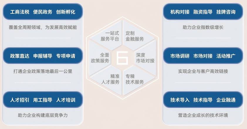 园区立足企业全生命周期发展需求,系统布局了总部办公、产研基地及定制化独栋等多元产业空间,配备多媒体路演厅、共享会议室等商务配套设施,以及智慧食堂、精品公寓、便利商街和运动场馆等生活服务空间,并精心打造屋顶花园、景观平台及近2万平方米的绿化景观,将生态理念融入园区肌理。项目构建了“六大产业运营服务体系”,打造了涵盖工商、人才、法律、财税等方面的一站式服务平台,从企业资质申报、知识产权保护到精准政策匹配,为入驻企业提供全方位服务及深度价值赋能。