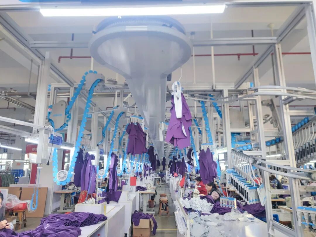 在缝制车间,衣服裁片被有序挂在工位上方的轨道上,依据预先设定的工序流程,自动送至相应工人手中。“行云流水”的精细化流程运作,得益于这套智能吊挂系统。据公司综合办主任介绍,今年6月投产的5条智能吊挂生产线,不仅实现了生产数据实时监测,更显著提升了整体作业效率。