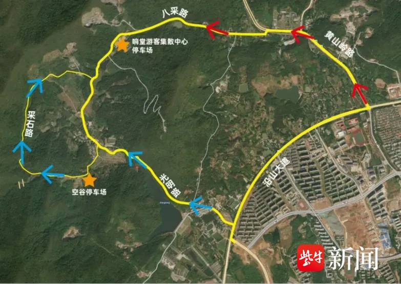 游客车辆可从黄山岭路进入响堂,将车辆停靠在游客集散中心停车场,乘坐接驳车前往活动主会场。游玩结束后乘坐接驳车返回游客集散中心停车场,车辆从黄山岭路驶出响堂。