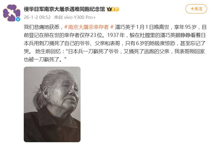 记者今天从侵华日军南京大屠杀遇难同胞纪念馆获悉,南京大屠杀幸存者潘巧英于1月1日晚去世,享年95岁。