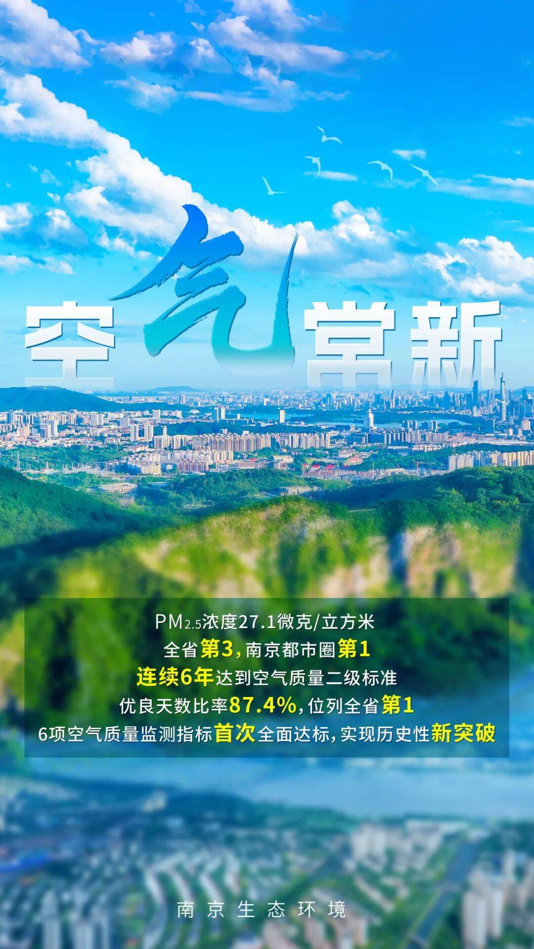 “2025年,我市环境空气质量持续改善,达到历史最好水平。”发布会上,南京市生态环境局党组书记、局长李文青介绍。南京全市PM2.5浓度27.1微克/立方米,位列全省第三、南京都市圈第一,同比改善4.2%,连续6年达到国家二级标准;优良天数比率87.4%,位列全省第一,同比增加5天;6项空气质量监测指标首次全面达标,实现历史性突破。