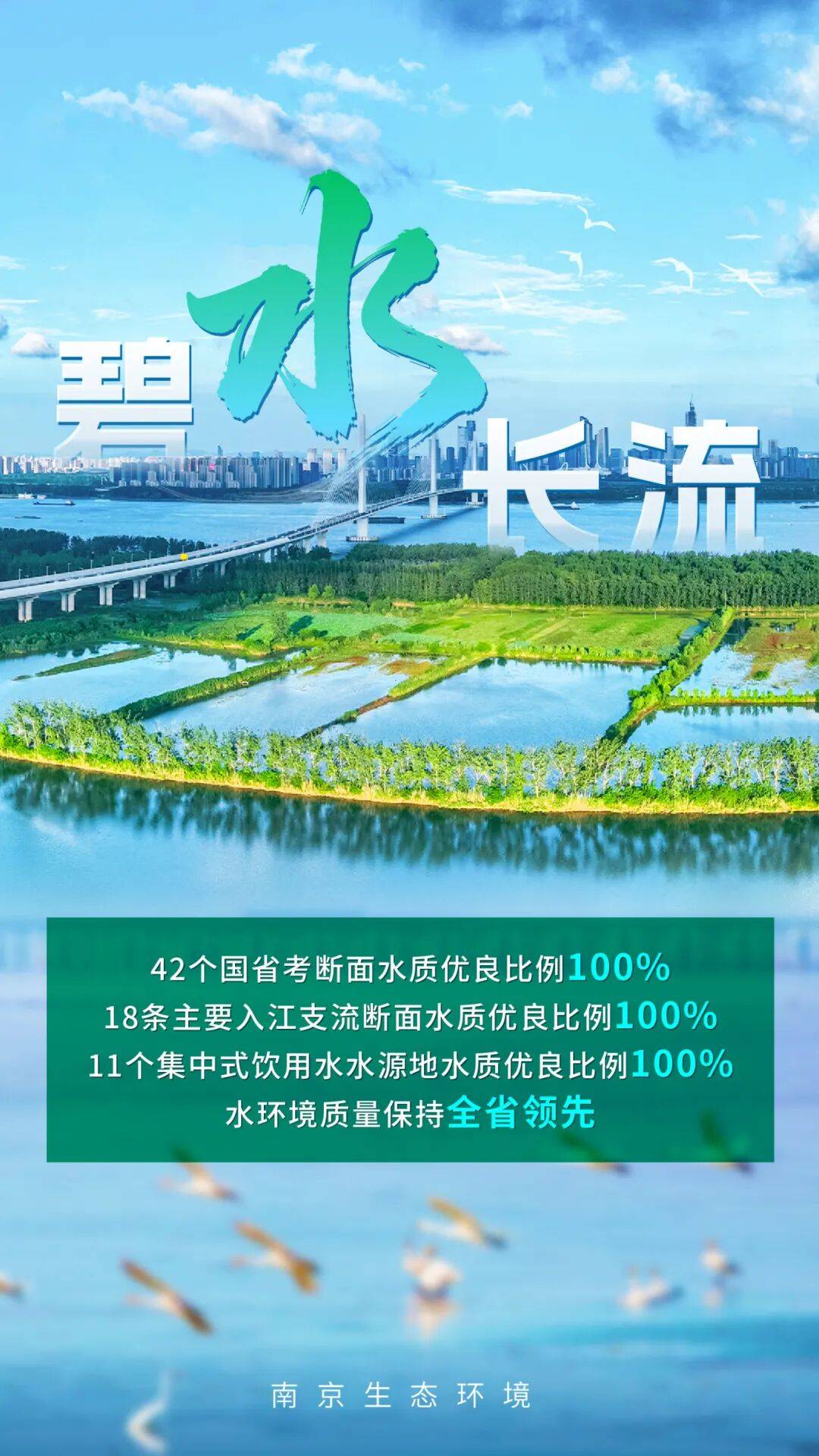 如果说蓝天是城市的呼吸,那么碧水则是流动的血脉。过去一年,南京深化水资源、水环境、水生态“三水”统筹,水美金陵展开新画卷。全市水环境质量保持全省领先,实现三个“100%”优良:42个国省考断面水质优良比例100%、18条主要入江支流断面水质优良比例100%、11个集中式饮用水水源地水质优良比例100%。