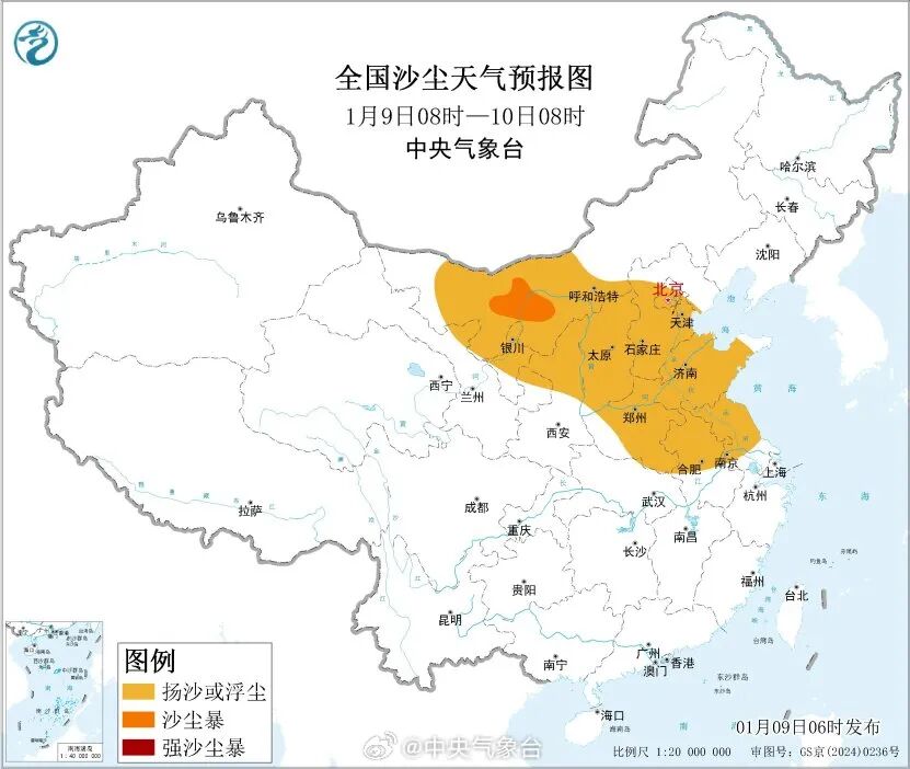 预计,9日08时至10日08时,内蒙古西部、宁夏中北部、陕西中北部、山西、河北中南部、北京、天津、河南、山东、安徽北部、江苏中北部等地的部分地区有扬沙或浮尘天气,其中内蒙古西部局地有沙尘暴。