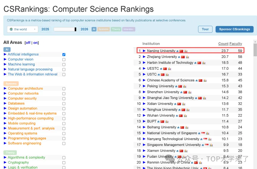 近日,计算机科学领域权威榜单2026 CSRankings正式发布,在人工智能学科的全球排名中,南京大学以23.7的分数位居全球第一,这一成绩不仅刷新了国内高校在该榜单的历史最佳表现,更标志着中国人工智能研究实力正式站上世界之巅。