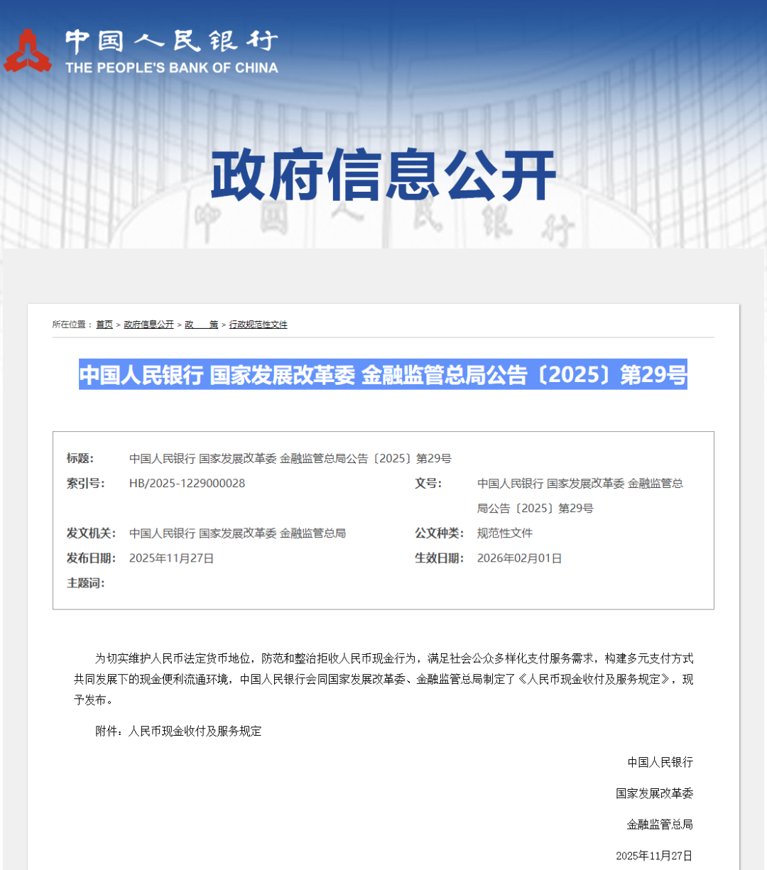 日前,中国人民银行会同国家发展改革委、金融监管总局制定了《人民币现金收付及服务规定》,切实维护人民币法定货币地位,防范和整治拒收人民币现金行为,满足社会公众多样化支付服务需求,构建多元支付方式共同发展下的现金便利流通环境。