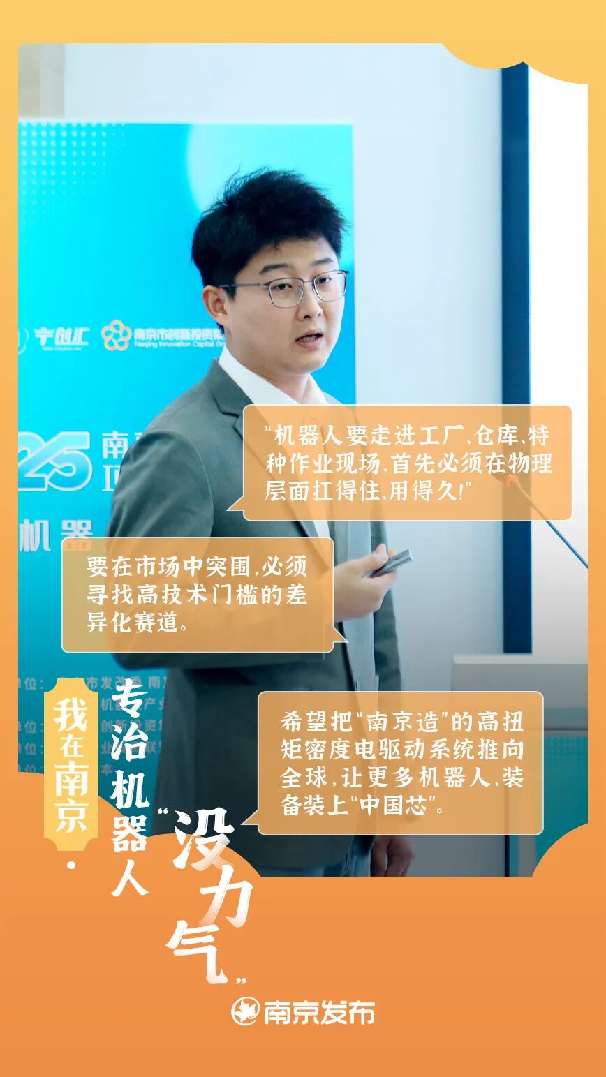 ○ 谈及为何选择南京江宁,白阳说,这里不仅有完整的产业链、高水平的高校院所资源,还有完善的人才政策和投融资平台,这里的人才服务响应度很高,我们有需要,他们就有响应。“对我们这种依赖持续创新的创业团队来说,这是非常宝贵的创新土壤。”展望未来,他希望把“南京造”的高扭矩密度电驱动系统推向全球,让更多机器人、装备装上“中国芯”,在全球产业变革中跑出中国速度、贡献中国力量。