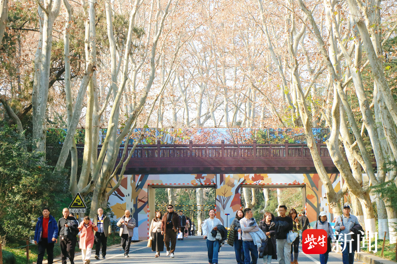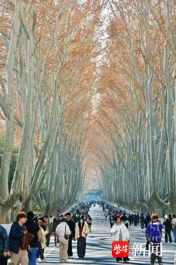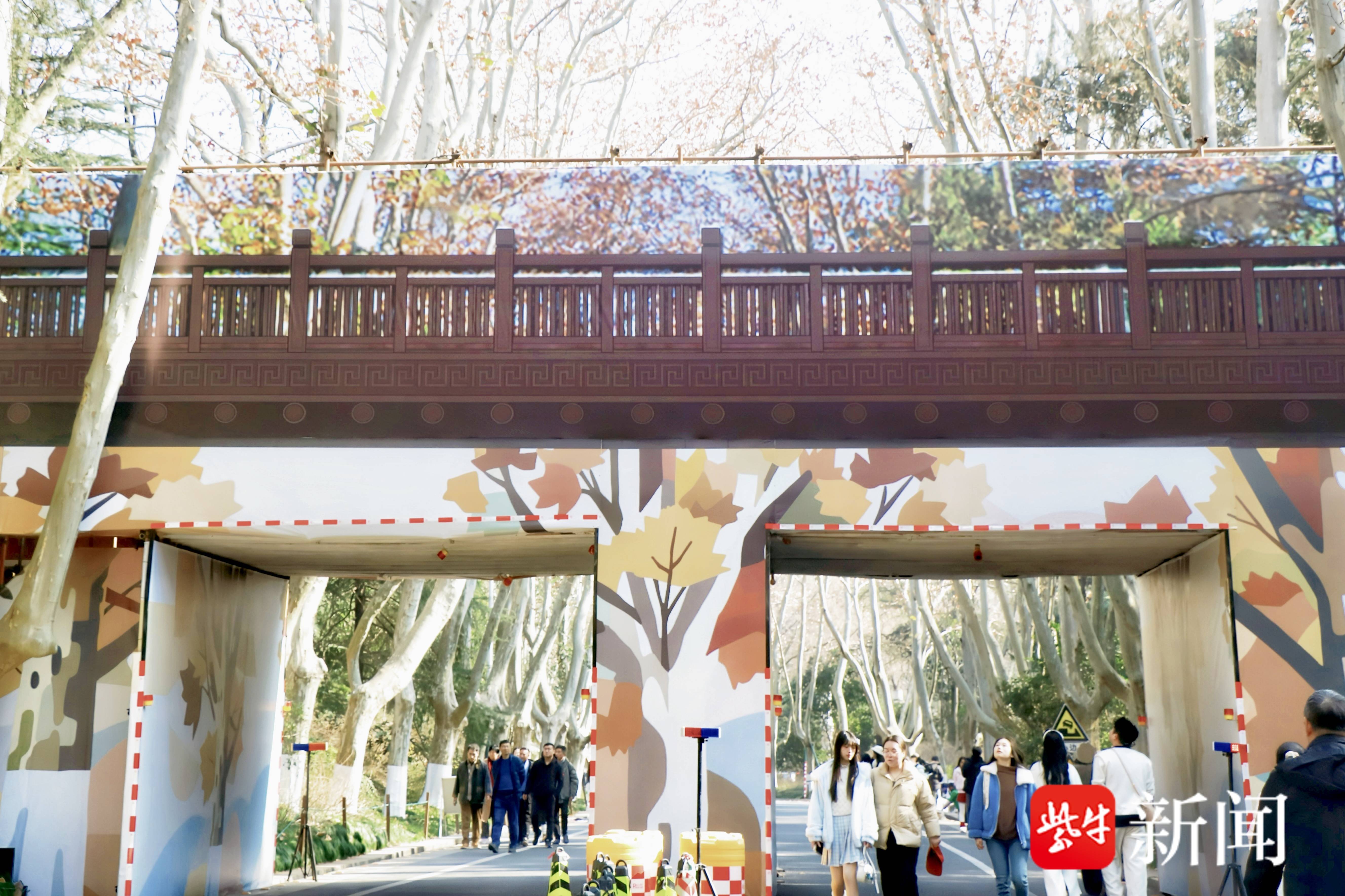 扬子晚报网1月13日讯(记者 王夕悦)近日,南京“梧桐大道”人行天桥换上了“2D限定版皮肤”。自2026年1月4日起至2026年2月10日,钟山风景区启动陵园路“梧桐大道”的系统维修工程,其间设置了近500平方米的巨幅喷绘作为围挡装饰。1月13日,记者在现场看到,围挡画面还原了天桥原貌及周边梧桐大道的秋冬风貌,金黄树叶与蓝色天空背景相映,许多游客在不远处以此为背景驻足拍照。