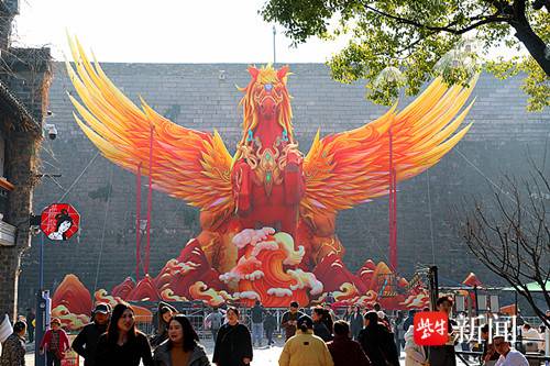 当日下午,来到老门东城墙脚下看到,下方有不少游客一睹震撼巨型生肖马宛如腾空而起的风采。一位来自河南的游客说:“巨型生肖马张开双翅,如‘展翅高飞’,真是太壮观!尤其是橙色烈马鬃毛飘逸、马头气宇轩昂,特别有气势,极具视觉冲击力。”