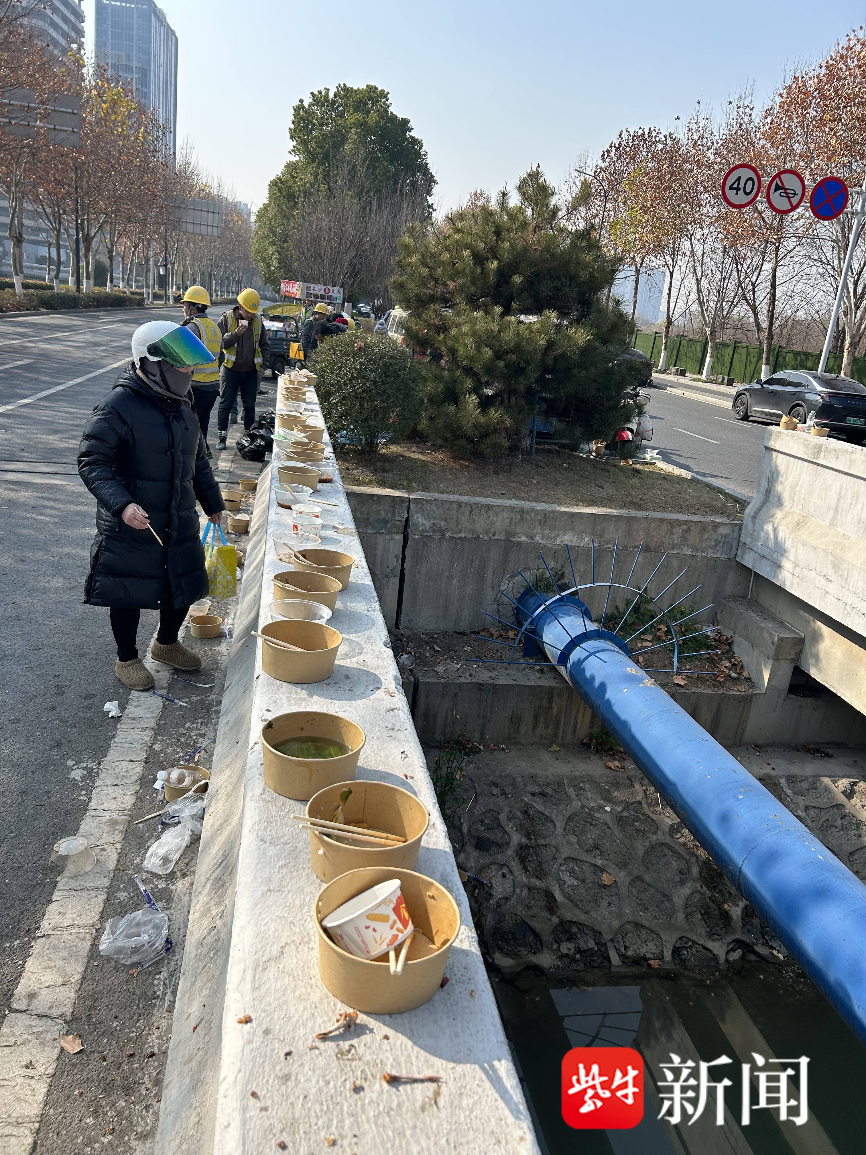 附近两家较大的工地回应是工地都有食堂,不过记者了解到他们所说的正规食堂在几公里外,施工现场虽然有就餐区域,但菜肴选择性较小,保温措施欠缺,留不住民工们;记者现场了解到,园区T6写字楼内有食堂,但对民工朋友们来说不实惠,大家选择在流动摊点上解决午餐。1月10日中午11点,记者在友谊河桥看到,就着桥栏就餐的现象依然,现场人满为患,调头车道完全被堵死,地面满是油污、筷子、塑料袋、纸巾。其中一名女摊主居然架着三脚架直播卖盒饭蹭流量。