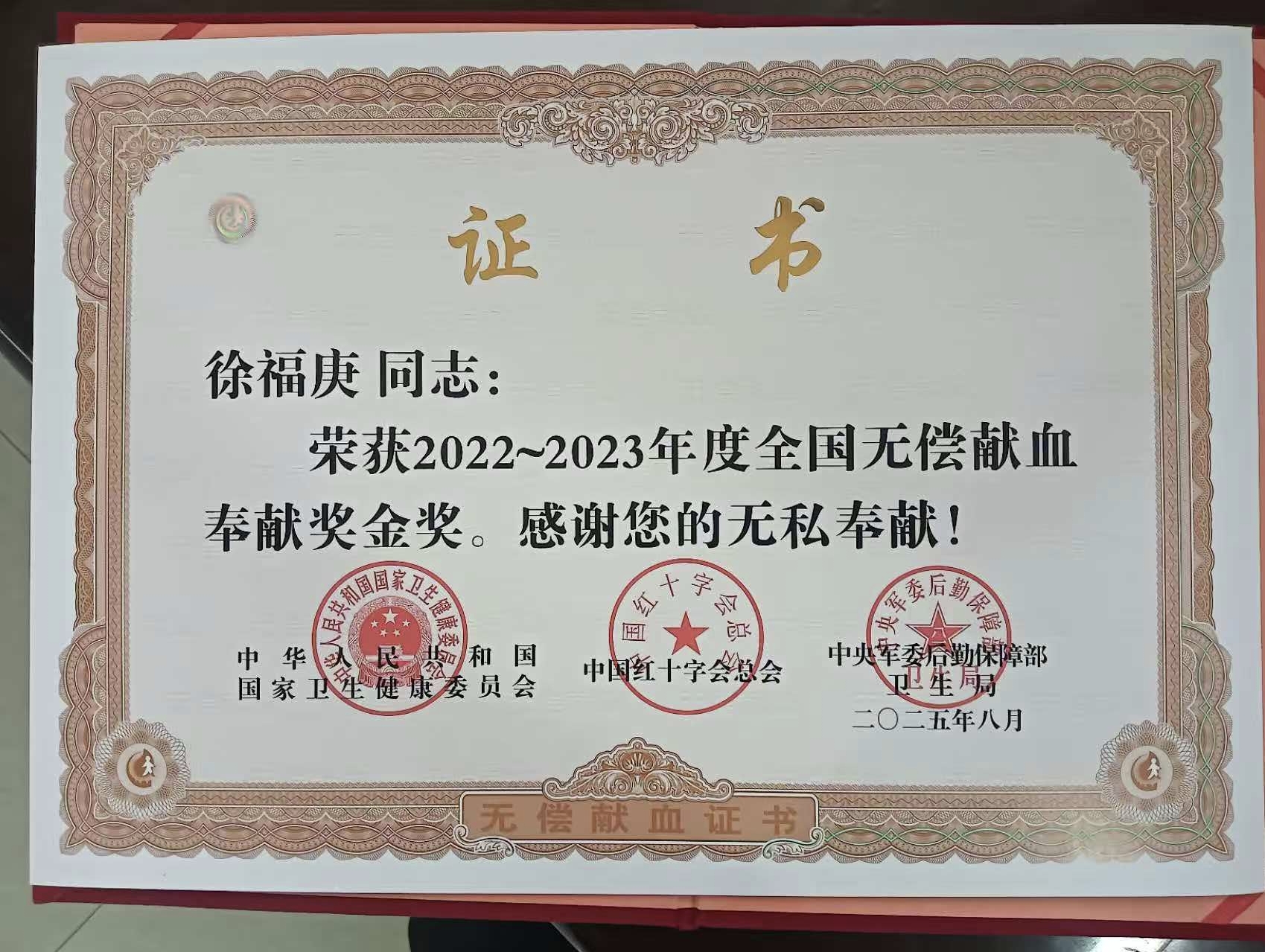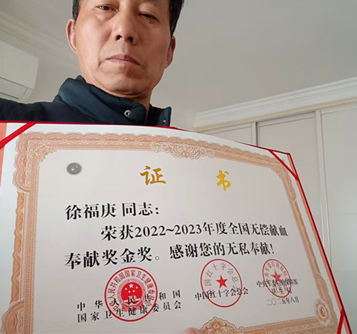 一摞献血证,见证了徐福庚无偿献血的热血历程:献血171次,其中,献全血14次,单采成分血157次,总献血量达6.78万毫升。大爱无言,徐福庚先后获得2012-2013年度全国无偿献血奉献铜奖,2016-2017、2018-2019、2020-2021、2022-2023年度全国无偿献血奉献金奖,2020—2021年度全国无偿献血奉献奖终身荣誉奖。其中,全国无偿献血奉献奖终身荣誉奖为全国无偿献血的最高奖项。