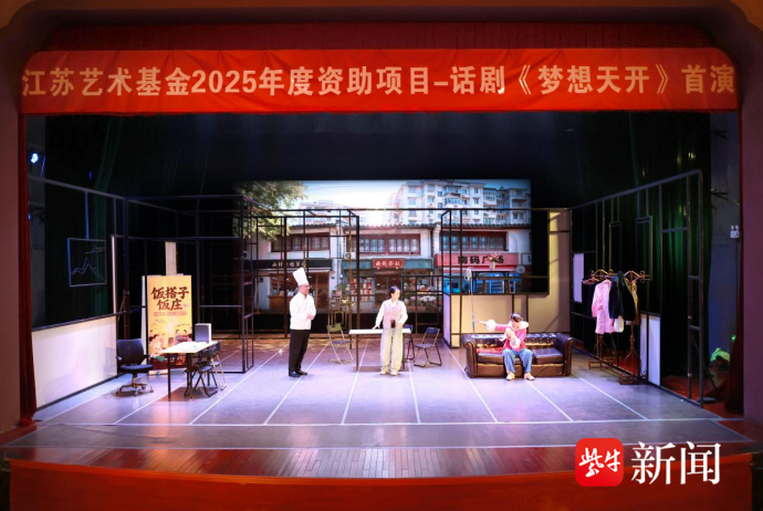 在众多剧目中,话剧《梦想天开》无疑是焦点中的焦点。这部剧是江苏艺术基金2025年度资助项目,此次既是首演也是展演季的开幕剧。该剧以珠江路三位“生活演员”的荒诞日常为切入点:他们周一穿西装“批贷款”,周三系围裙“卖盒饭”,周五穿护士服“查房”,这是三位主角“假装上班”的故事,一场场啼笑皆非的圆谎背后,是当代年轻人在梦想与现实间的挣扎与坚守。