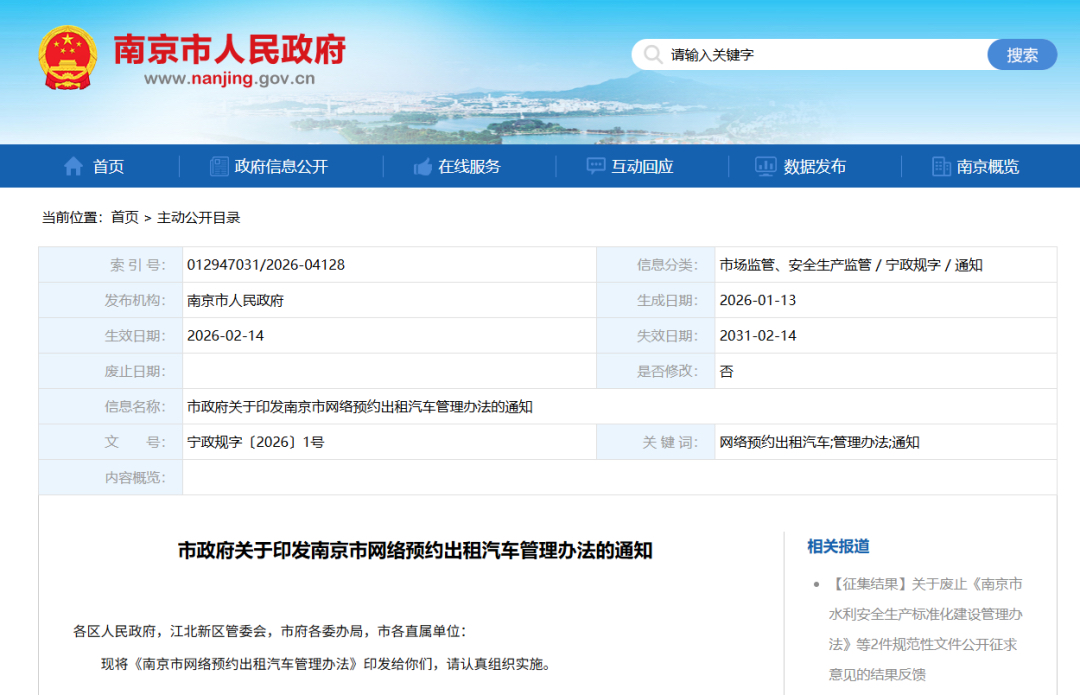 1月16日,南京市人民政府官网正式发布《南京市网络预约出租汽车管理办法》。该《办法》自2026年2月14日起施行,有效期至2031年2月13日。这是自2017年首版网约车管理办法实施以来,南京市首次对该政策进行系统性修订,旨在适应行业发展新形势,进一步规范市场秩序,保障各方合法权益。