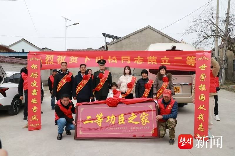 图为南京市溧水区军地联合送喜小组来到二等功臣卞世松家庭送喜报、牌匾和贺联等。彭芳 摄影