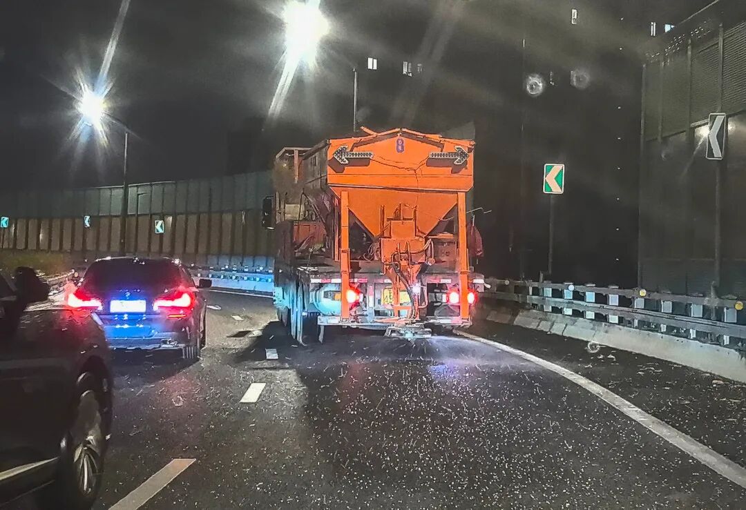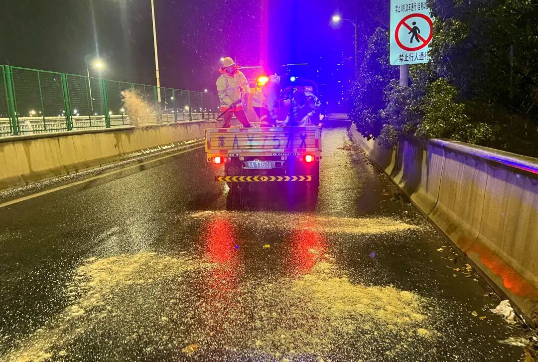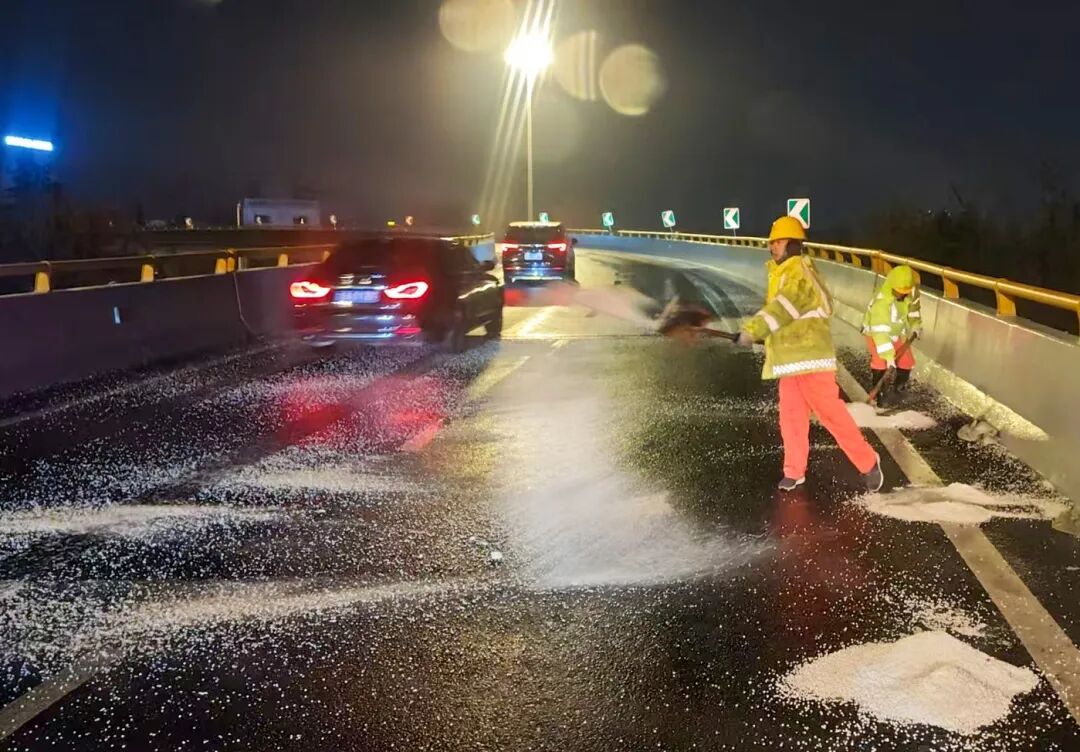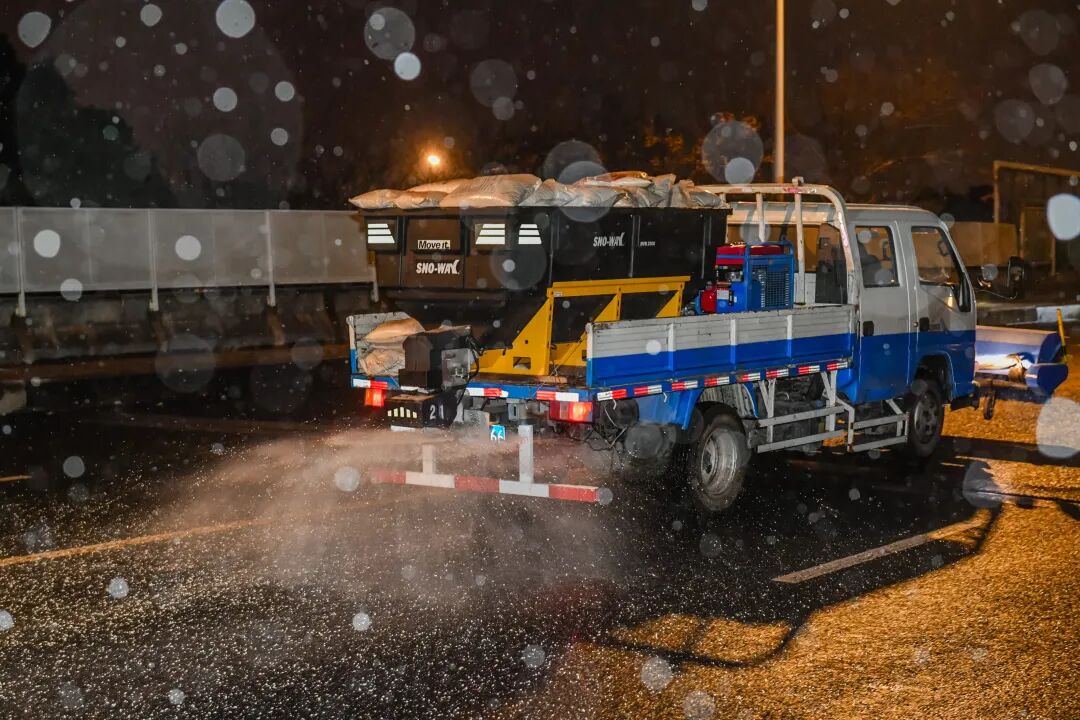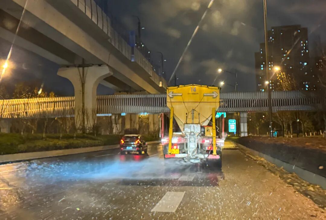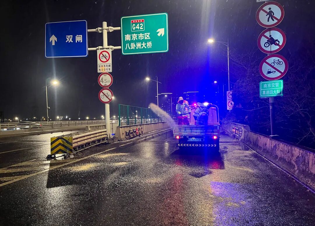 20日早晨6点南京市公路中心在长江大桥桥面撒布融雪剂