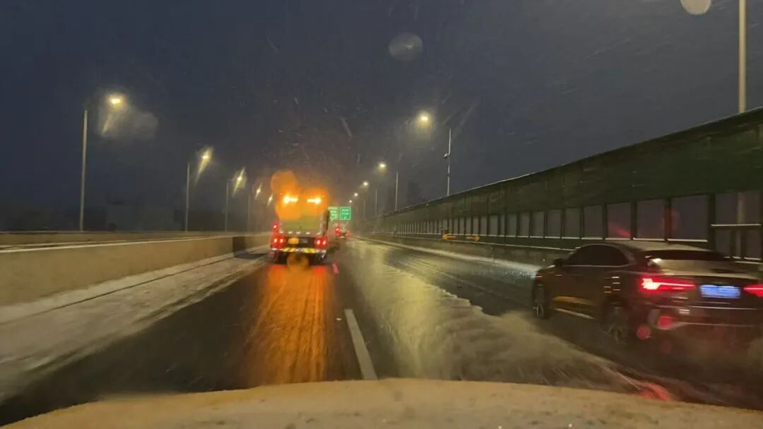 由于降雪地面湿滑, 目前沪宁高速、四桥、宁洛高速,采取1级管控,限速40km,其余高速采取2级管控,限速60km。请减速慢行,减少变道。