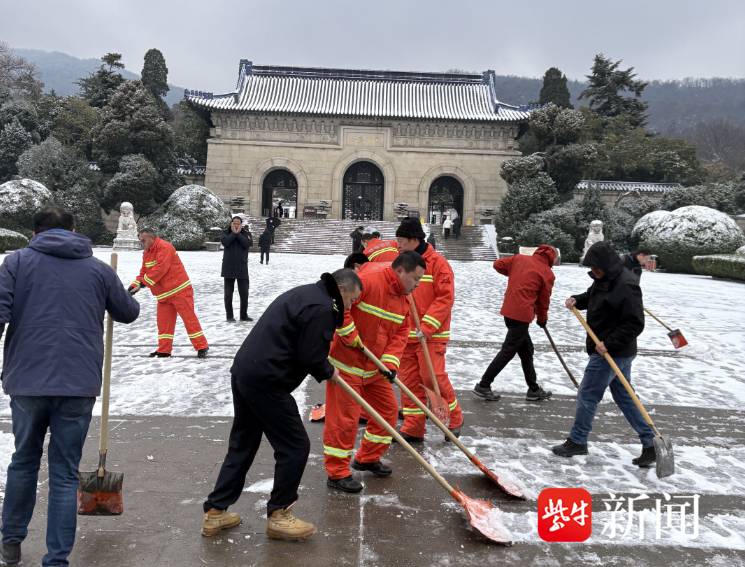 雪映紫金山,梅花山早梅已凌寒绽放。自降雪伊始,钟山风景区便启动应急机制,全员投入清雪行动。陵园路、紫金山路等主干道上,铲雪车、滚雪机等机械巡回作业;各景点步道、台阶、栈道旁,工作人员手持雪铲、扫帚进行清扫……同时,景区还贴心铺设防滑垫、设立提示牌,让赏梅赏雪之旅暖心更安心。