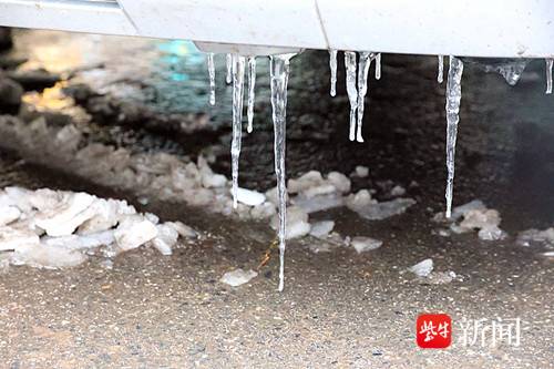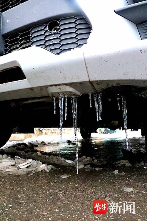 午后随着气温慢慢回升,积雪融化,导致积雪融化后迅速冻结,形成冰凌。在南京玄武区富贵山明城墙水槽挂着一撮冰凌,路边一辆面包车车头车门挂着不少冰凌。