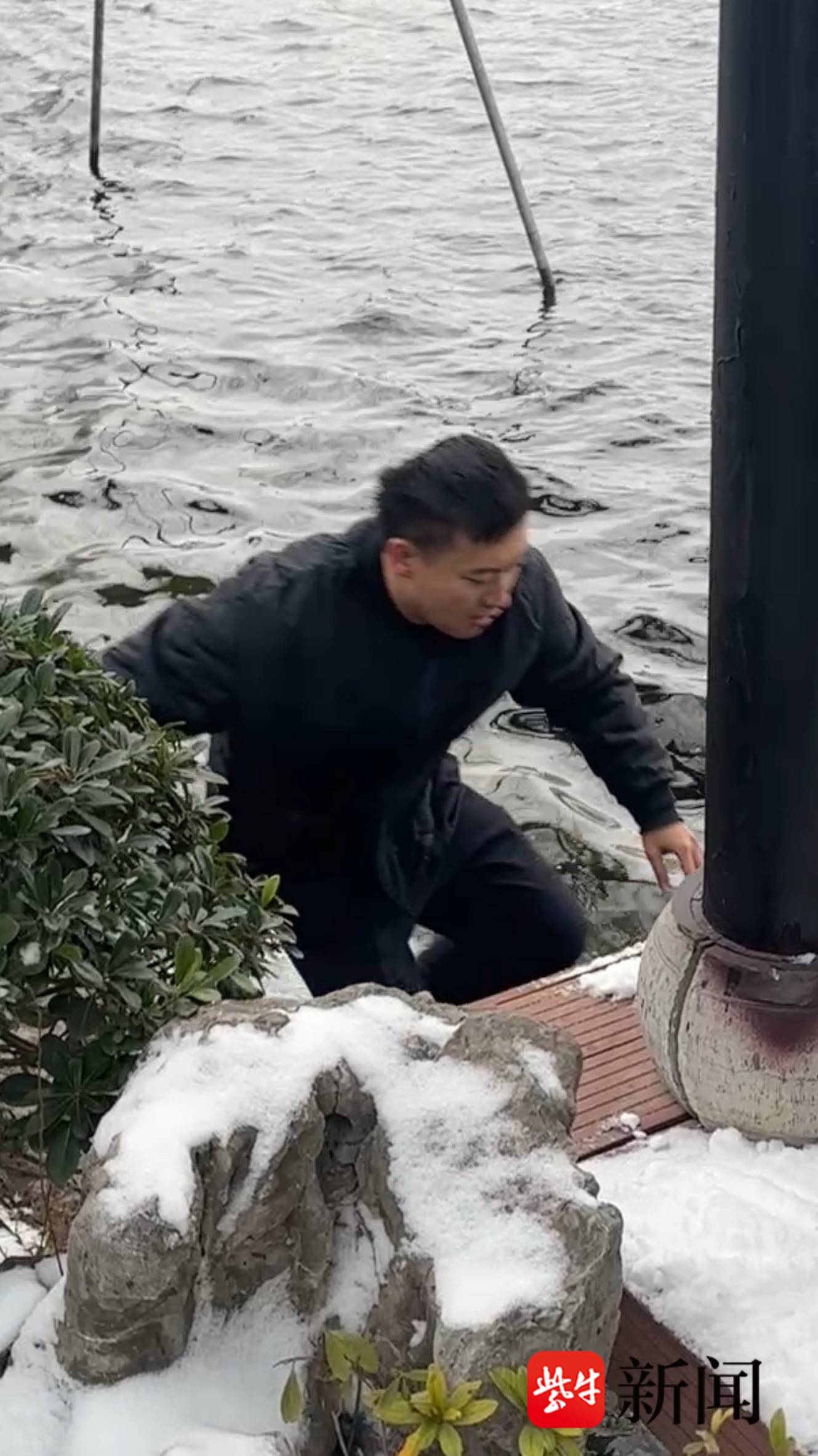 当天,南京市迎来了2026年的第一场雪,最低气温骤降至-5℃。下午四时许,南京警方接到市民报警称,建邺区某湖边一位老人不慎落水。警情就是命令!接警后,民警陈玉潇、闫松岳火速前往救援,3分钟就到达现场。经过紧张搜寻,最终在湖边栈桥的正下方发现了被困水中的老人。栈桥下空间狭窄且距离岸边较远,竹竿够不着,救生圈也扔不进去。此时老人在水中瑟瑟发抖、脸色惨白。