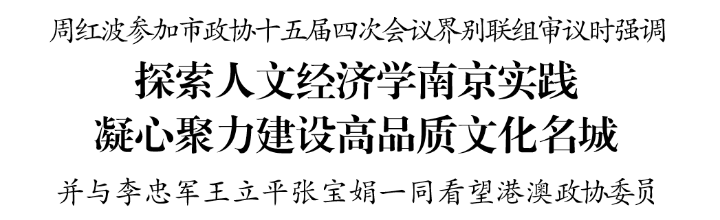 周红波对各位委员的建言献策和过去一年全市广大政协委员的积极工作表示感谢。他说,文化是一座城市最独特的标识和最深厚的基因。将“文化赋能”作为“十五五”时期高质量发展的战略重点,是发挥好南京深厚的历史文化底蕴优势、践行“人文经济学”、提升城市软实力的内在要求。希望广大政协委员发挥优势、积极作为,主动建诤言、献良策、谋实招,为推进中国式现代化南京新实践注入强大的文化力量。要聚焦文化赋能,探索人文经济学南京实践,不断提升城市的知名度、美誉度、吸引力;要守护文化根脉,谋划文化遗产保护之策,保留城市历史风貌、传承文化记忆、延续文化生态;要做好融合文章,优化载体布局,更新资源业态,释放消费潜力,增强文化产业发展动能;要聚焦为民惠民,加强优质文化产品供给,丰富群众精神文化生活,涵养文明风尚,促进城市文明整体提升。