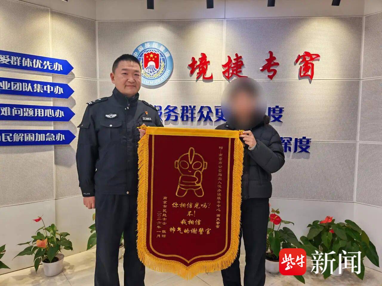 1月19日,赵女士手持一面特别的锦旗,来到南京公安出入境受理大队,向民警谢爽由衷致谢。“非常感谢‘境捷专窗’对我的帮助,为我的人生带来新的转机和希望,相较于光之使者我现在更相信谢警官。”赵女士由衷地说出心里话。