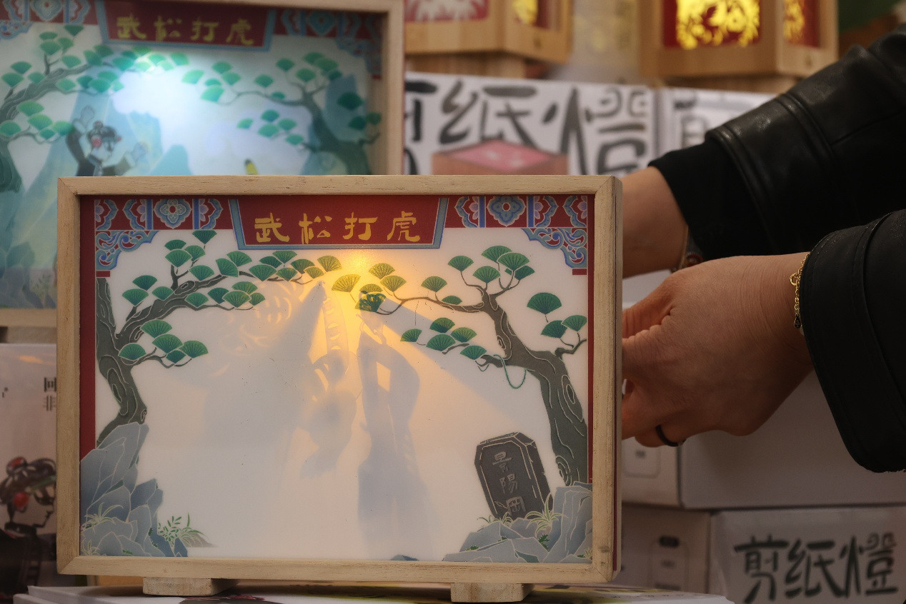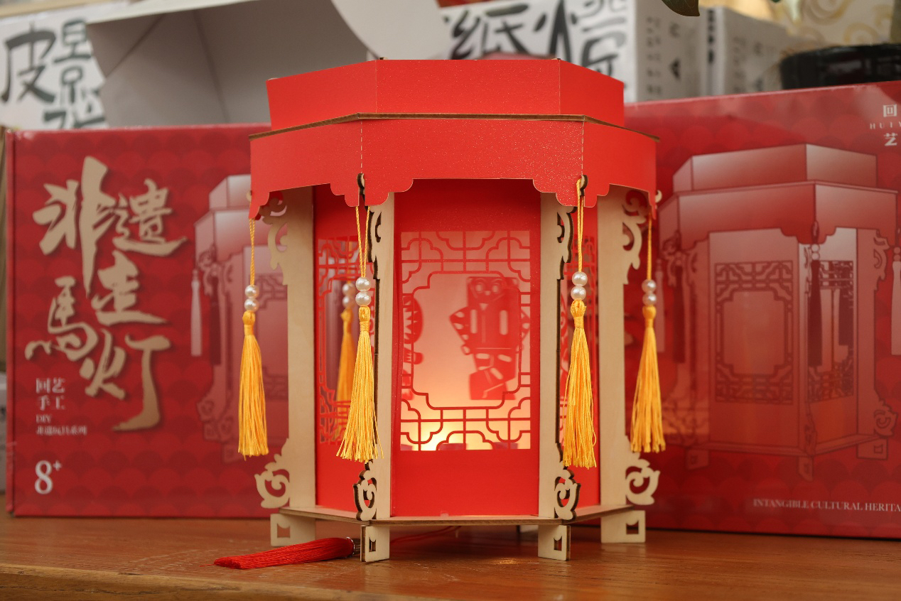 非遗剪纸走马灯是非遗馆研发出的第一款非遗潮玩。在过去,走马灯象征着吉祥如意、时间流转和家庭团圆,同时也是中国传统文化的重要载体。美基艺术馆的非遗手作人们保留了其美好寓意和关键技术,历经定稿到试验再到真正上市,前前后后花费了半年多的时间。走马灯四个面的剪纸图案采用的是艺术馆自己设计的IP形象。灯笼底部放置的蜡烛燃烧会产生热能,在灯笼内起到涡轮增压的作用,从而达到让灯“走”起来的效果。当灯笼底部的蜡烛点燃,灯笼旋转,不同的IP人物不断变换,美好的祝福或许也正在生效。