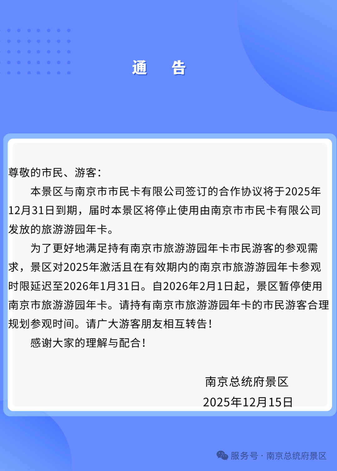 2025年12月15日,南京总统府景区发布通告,由于与南京市市民卡有限公司签订的合作2025年12月31日到期,届时景区将停止使用南京市市民卡有限公司发放的旅游游园年卡。同时为了满足持有南京市旅游游园年卡市民游客的参观需求,景区对2025年激活且在有效期内的南京市旅游游园年卡参观时限延迟至2026年1月31日。自2026年2月1日起,景区暂停使用南京市旅游游园年卡。