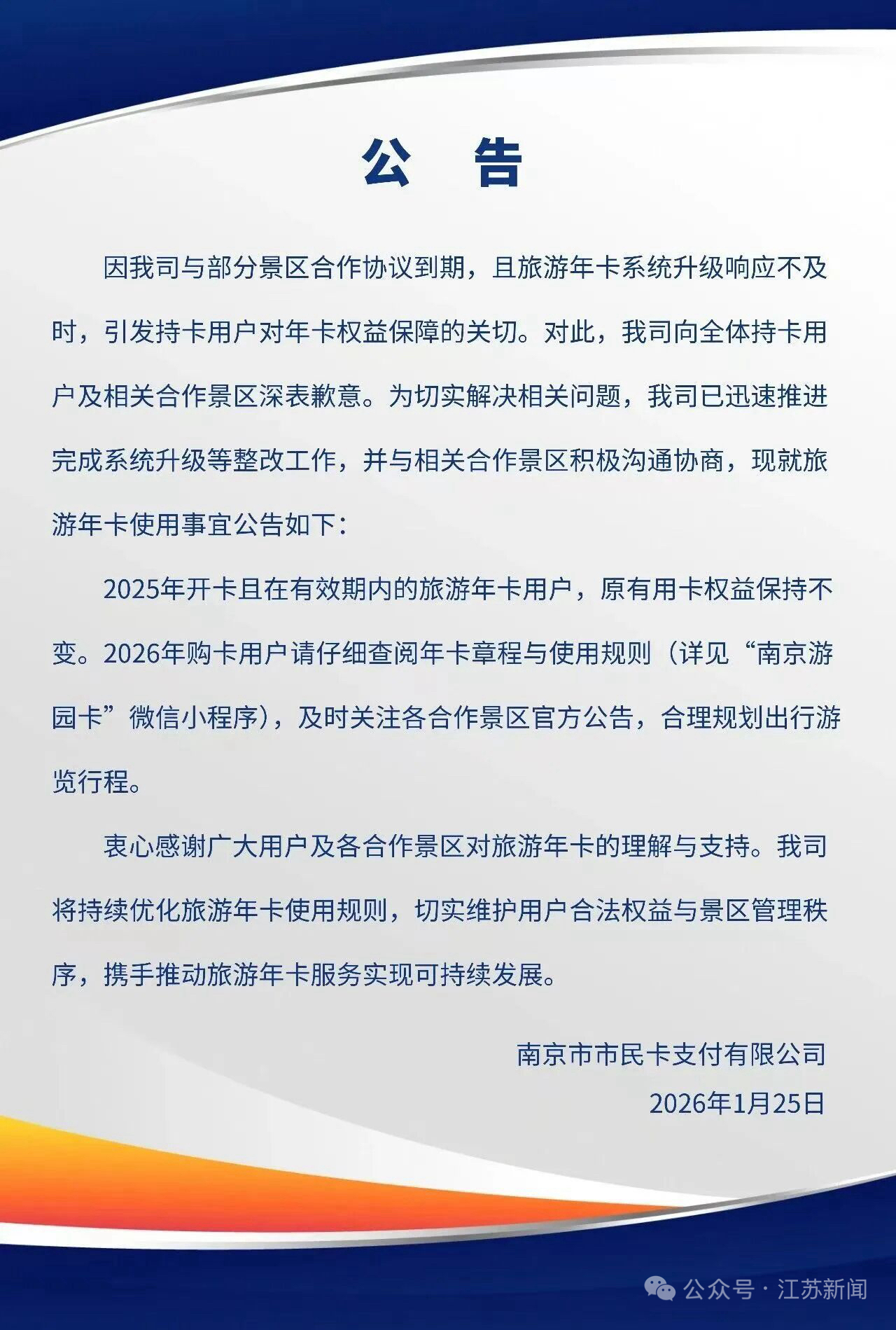 近日,南京市市民卡支付有限公司发布官方公告,就南京旅游游园年卡相关使用权益作出明确说明,回应社会关注。公告指出,2025年开卡且仍在有效期内的旅游年卡用户,原有用卡权益将保持不变,不受相关景区合作调整影响。