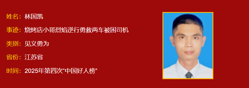 林国凯,男,1991年5月生,江苏省南京市鼓楼区某烧烤店工作人员。2025年9月,南京市栖霞大道快速路上发生一起两车碰撞事故,火势一触即发。危急关头,驾车途经的林国凯迅速靠边停车,冲向事故车辆,冒着生命危险徒手从破窗中拖拽出前车被困驾驶员,又协助后车怀孕司机疏散至安全地带。林国凯曾荣获江苏省见义勇为专项奖励。